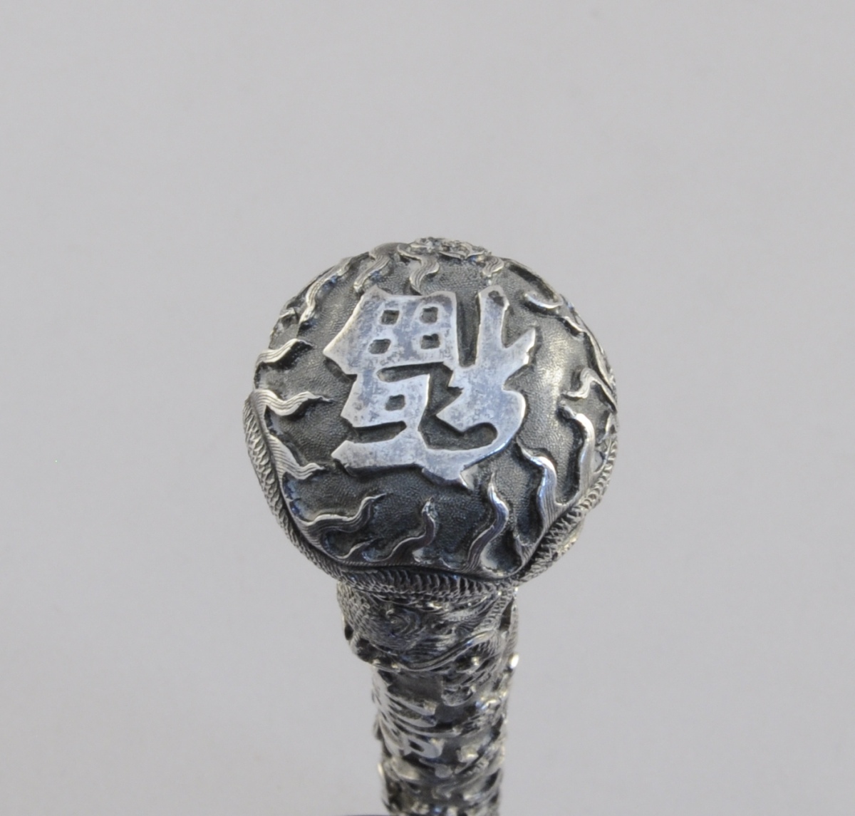 CHINE. POMMEAU DE CANNE en argent finement sculpté de dragons et d'idéogrammes.