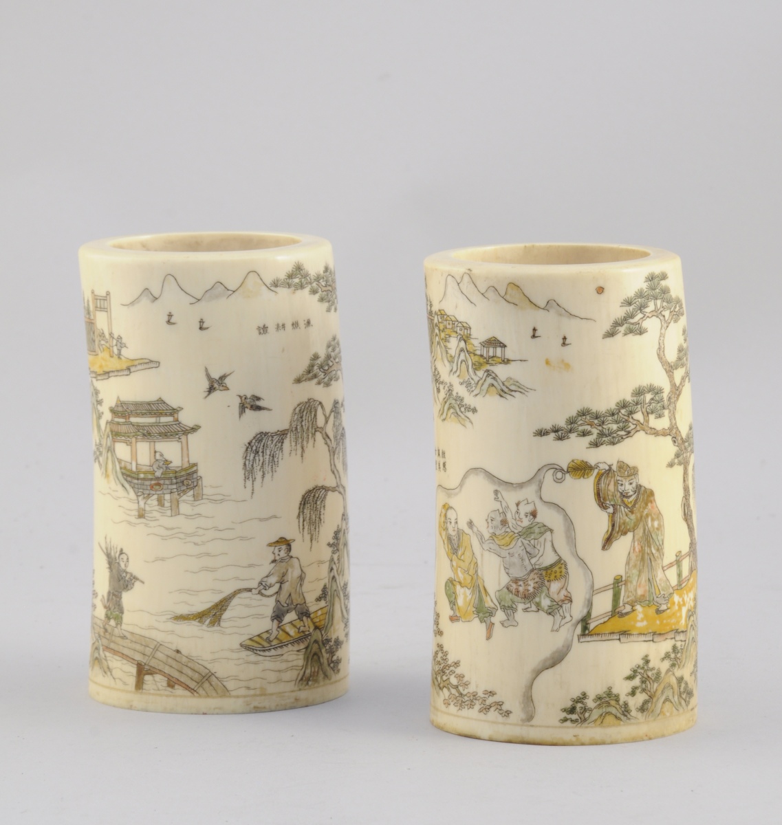 CHINE. Paire de TRONÇONS de DÉFENSES en ivoire polychrome gravés de scènes lacustres.