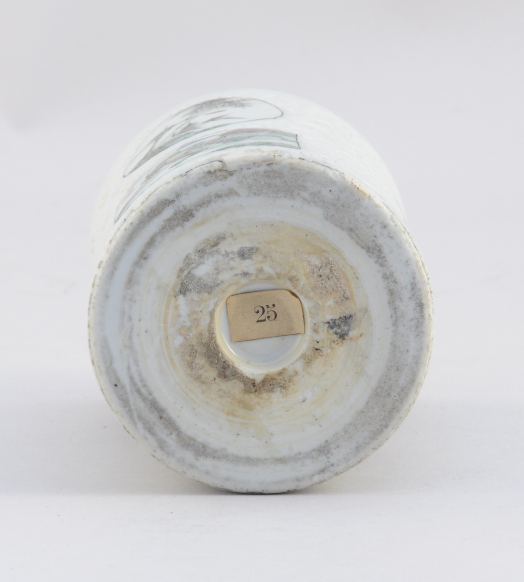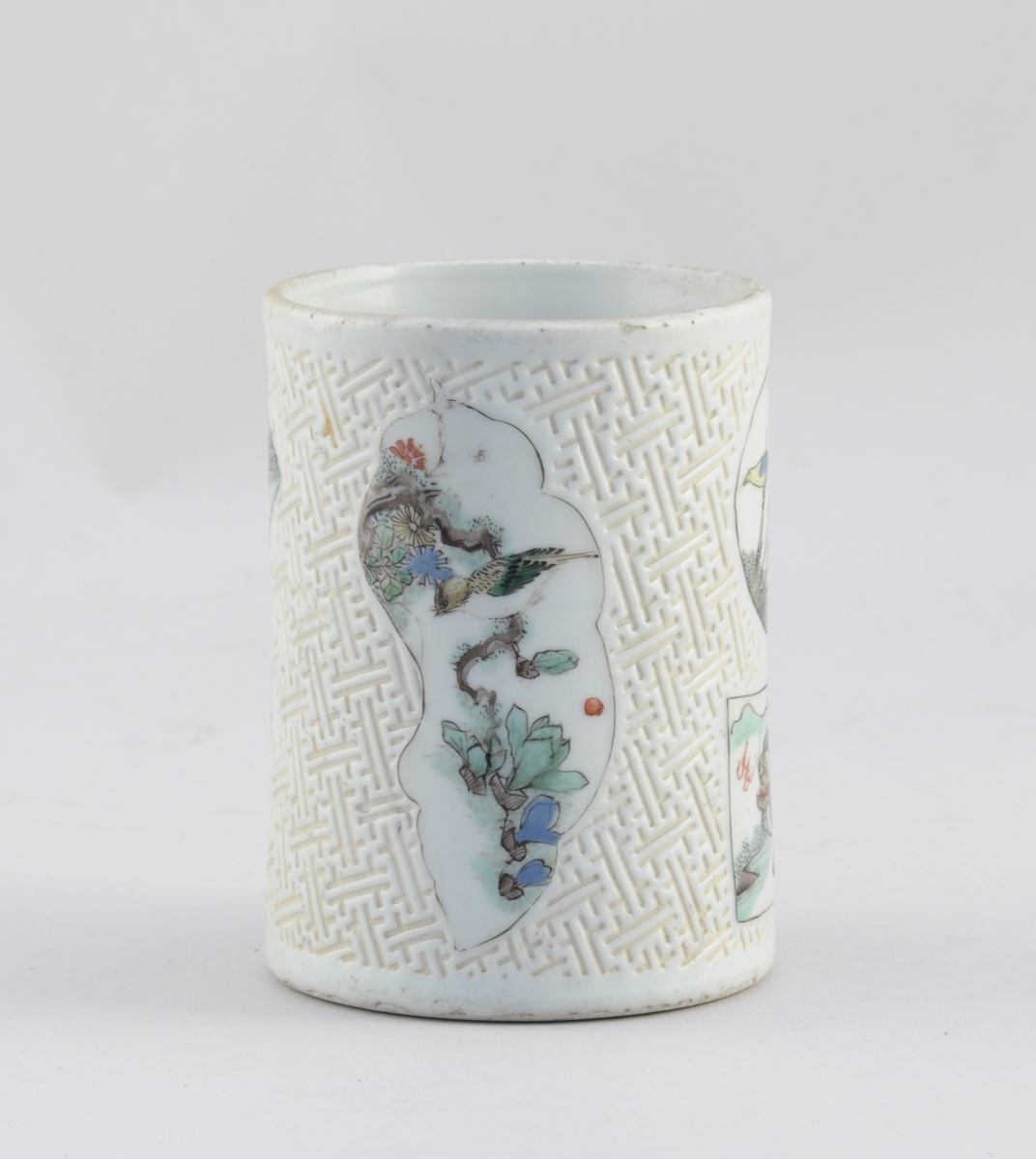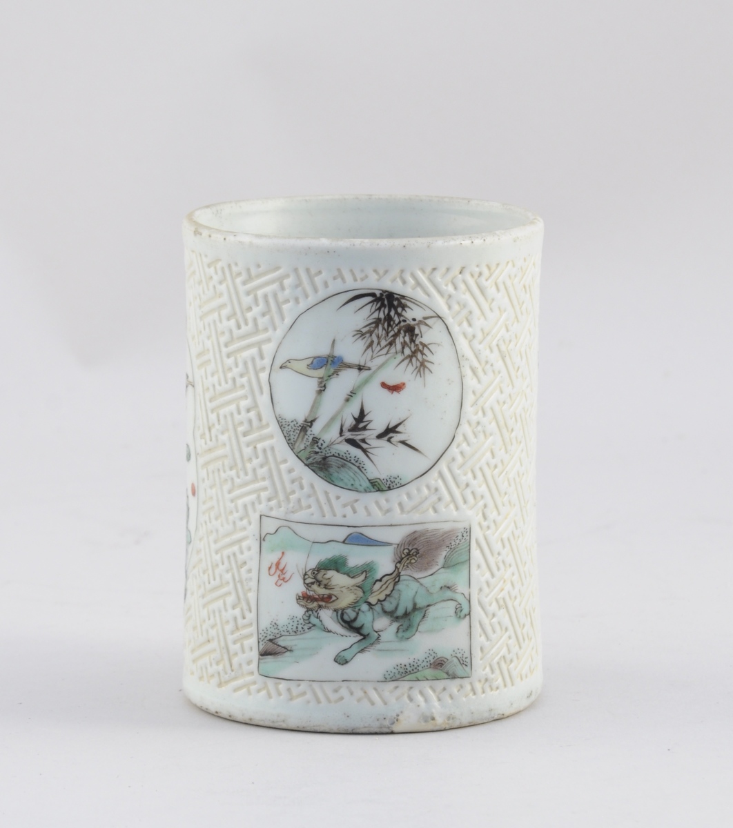CHINE. POT À PINCEAUX en porcelaine blanche, décor moulé de grecques, médaillons peints en émaux polychromes de scènes de jardins.