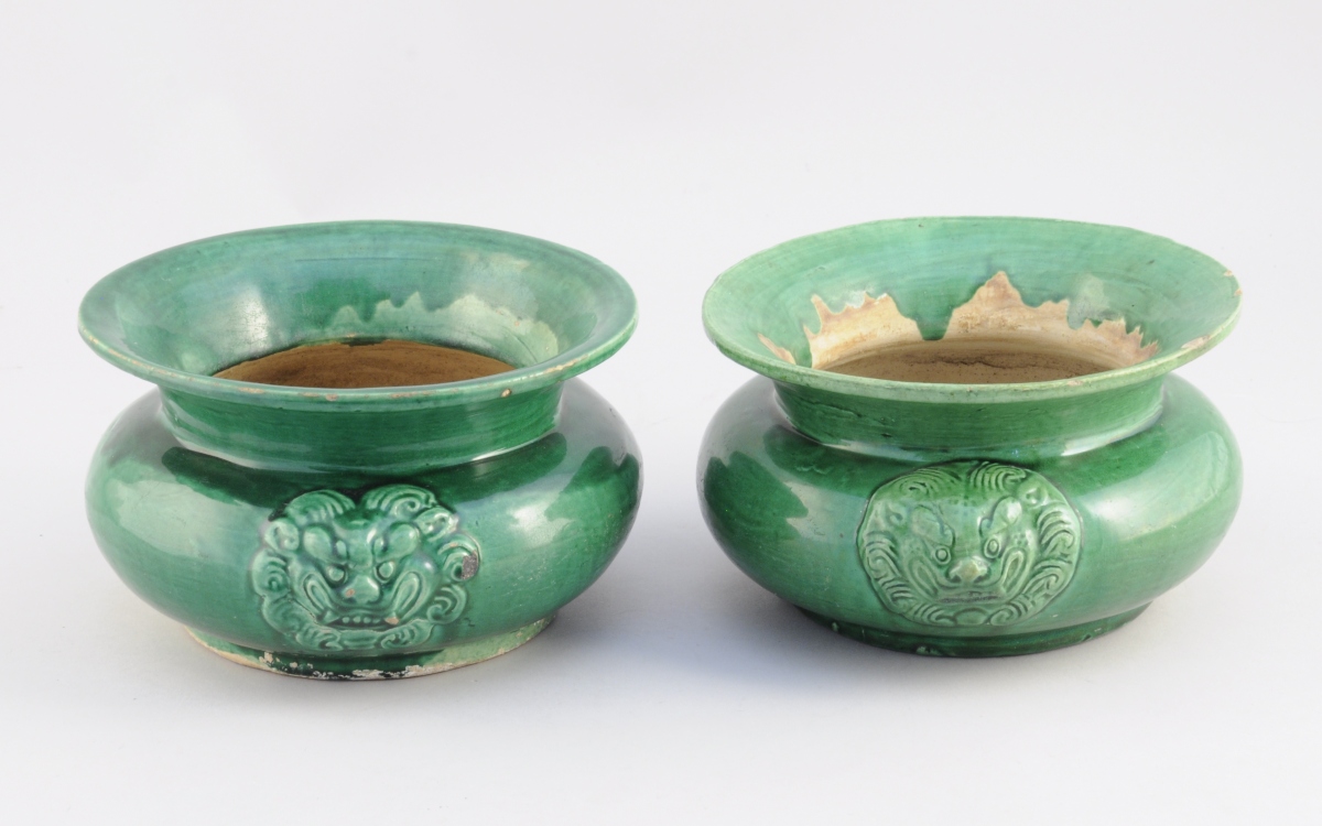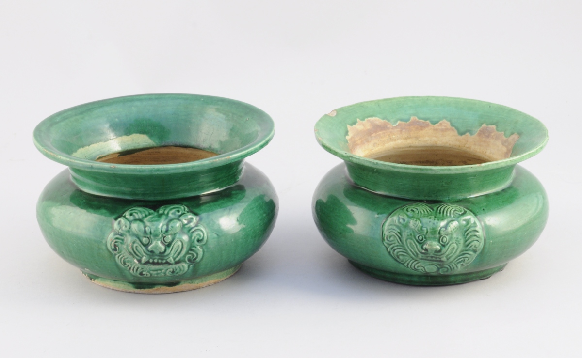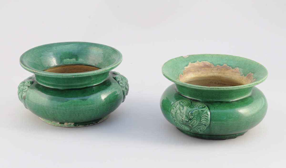 CHINE. Deux CRACHOIRS de forme circulaire en terre cuite vernissée verte, anses à mufles de lion.