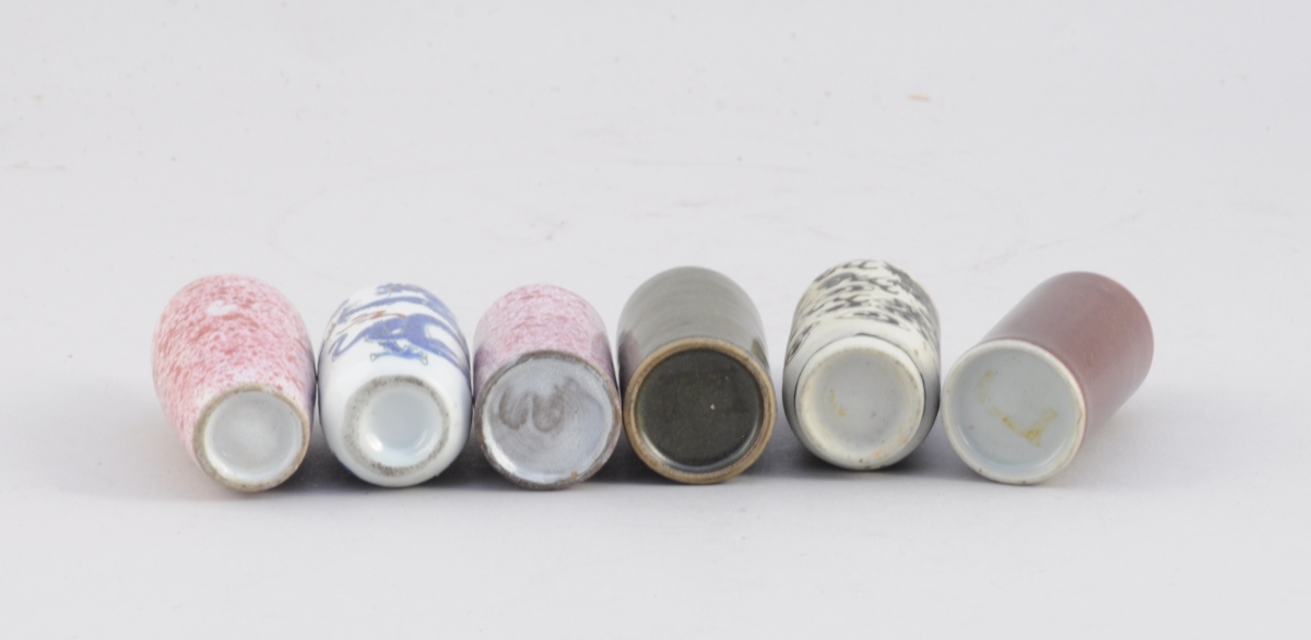 CHINE. CHINE. 6 FLACONS-TABATIÈRES en porcelaine rose, verte, noire et blanche et une à motif d'un dragon.