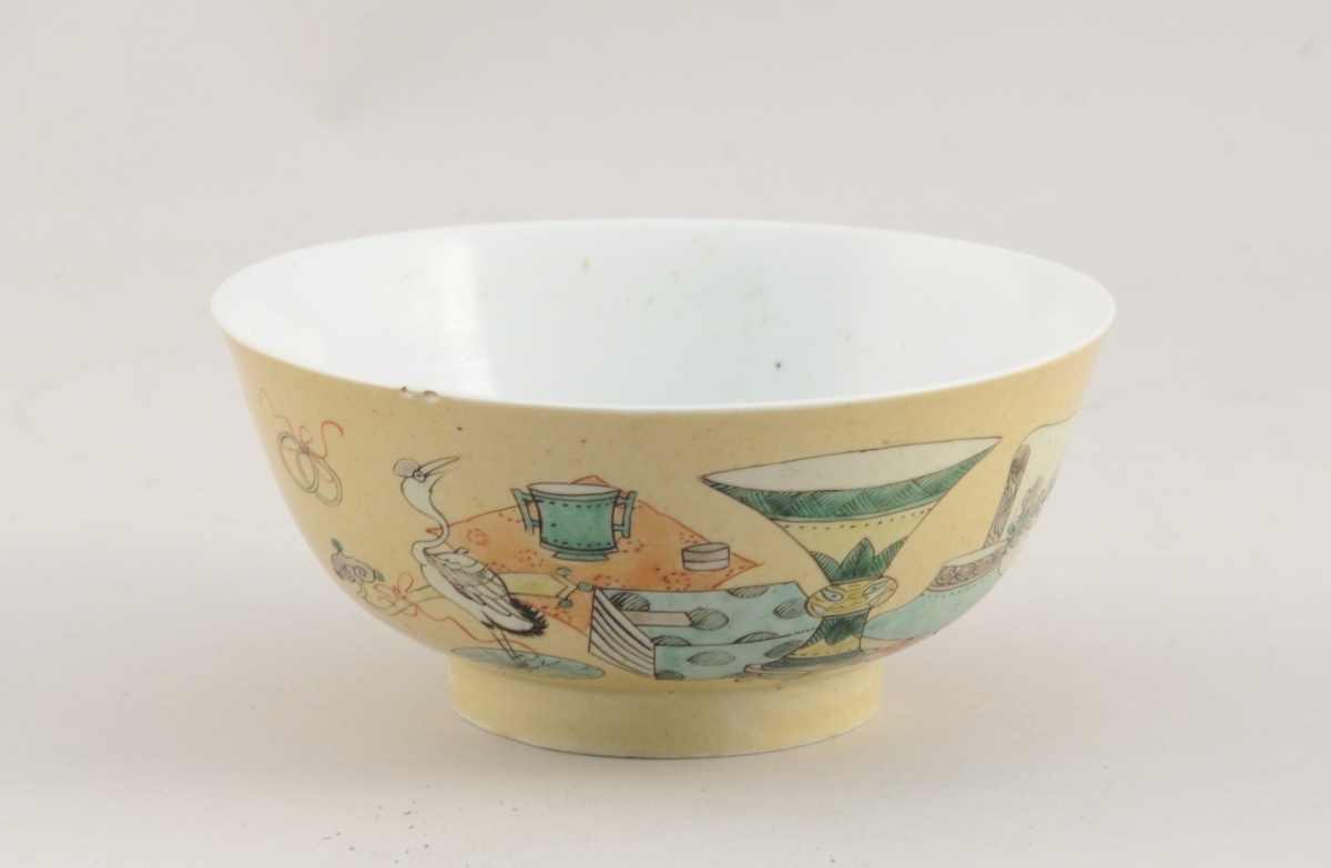 CHINE. COUPE sur TALON en porcelaine à décors d'émaux polychromes de la famille verte figurant des grues et des vases, une fleur polychrome à l'intérieur. L'extérieur émaillé capucin. Étiquette "Mon F. Langweil" à Paris".