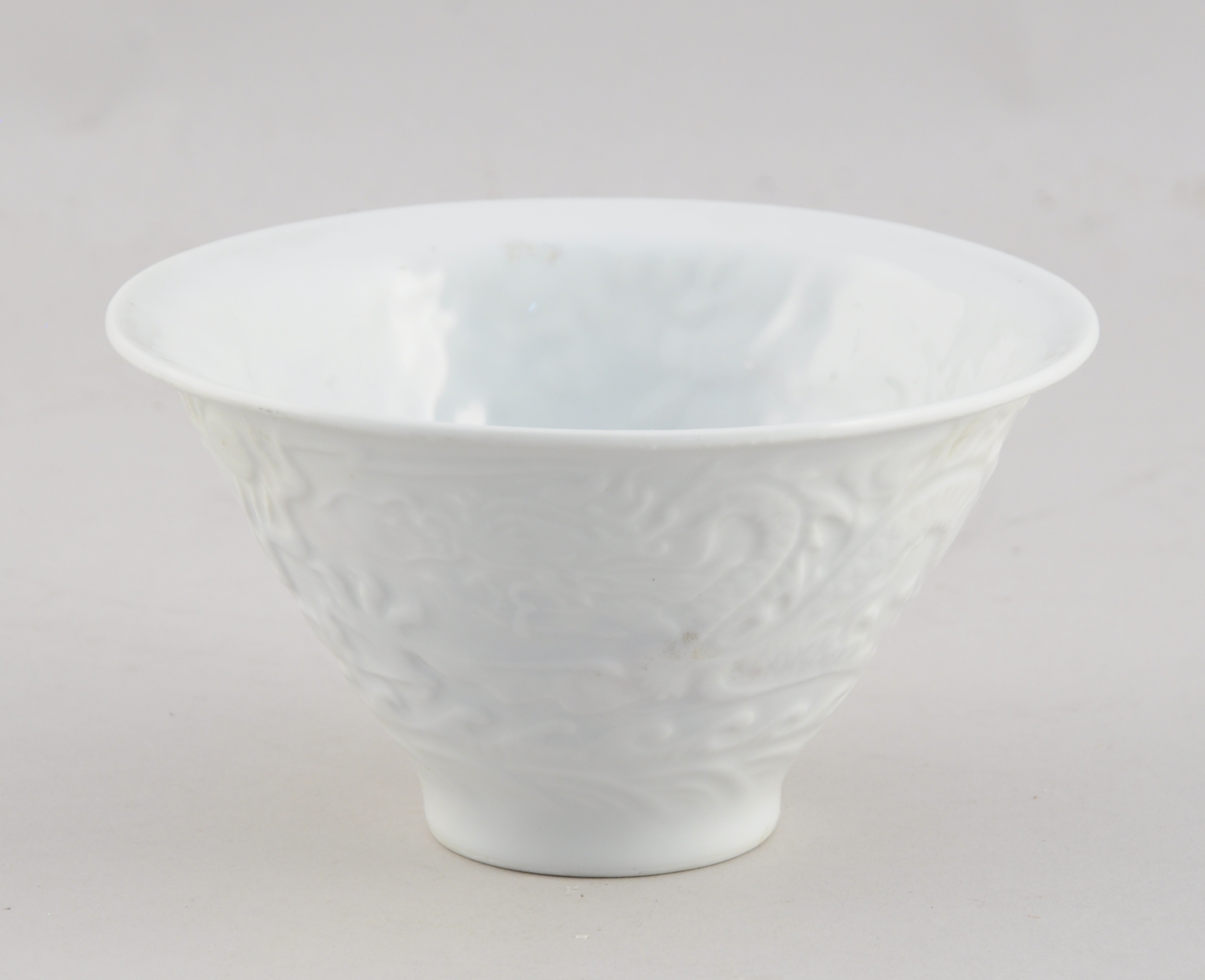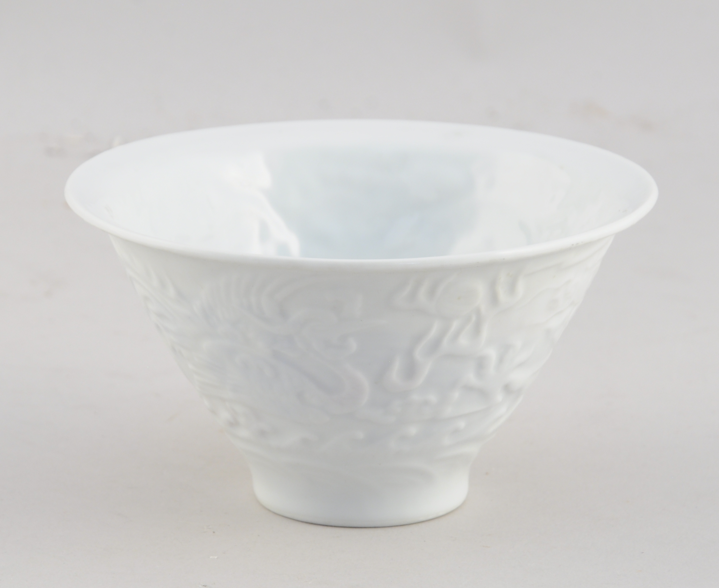 CHINE. BOL en blanc de Chine à décor en léger relief d'un dragon et d'un phénix pourchassant la perle sacrée à travers les nuées.