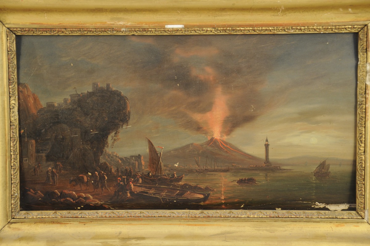 Notre tableau montre la fascination des artistes autour de Pierre Jacques Volaire, Saverio Della Gatta face au spectacle du volcan. La vision nocturne permet d'en accentuer les pouvoirs expressifs et s'inscrit dans l'esthétique nouvelle du sublime. Le traitement du rocher sur la gauche, de ses constructions de la végétation, comme le pittoresque de la scène avec ses embarcations caractérisent le paysage romantique.