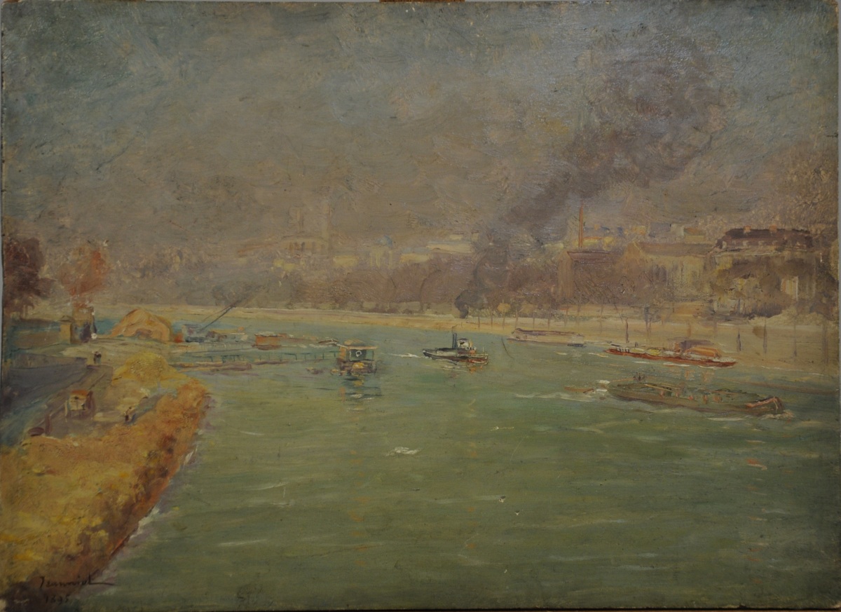 Georges JEANNIOT (1848-1934).La Seine à Paris, vue du Trocadéro.Panneau signé...