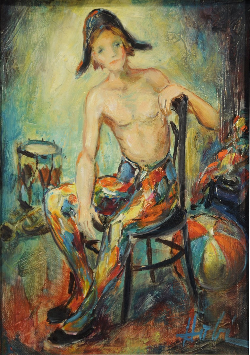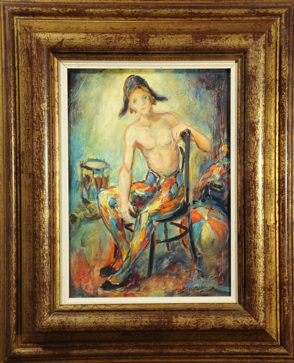 HOBI (1939-1998)Arlequin à la chaise.Huile sur toile, signée en bas...