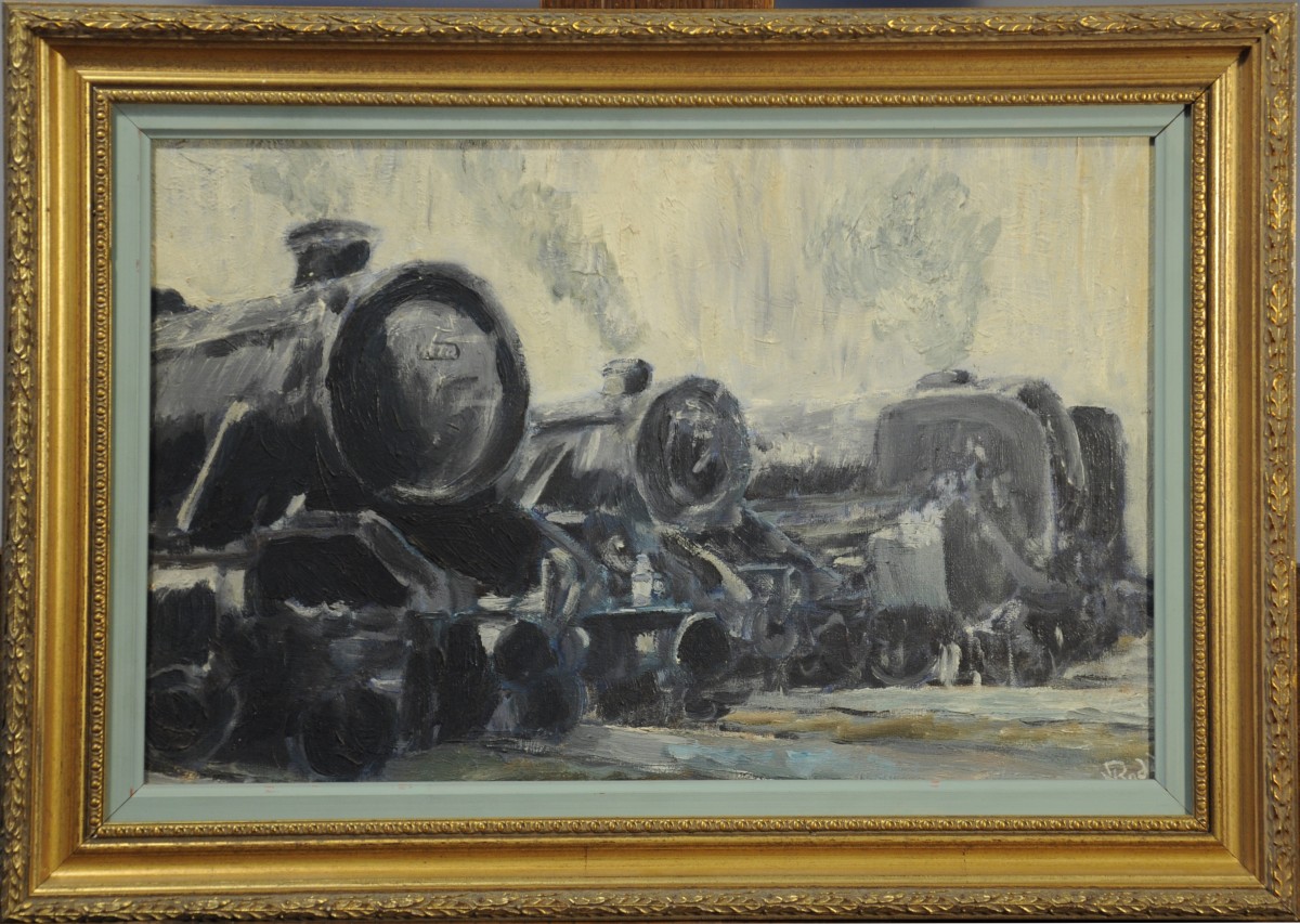 École MODERNE.Locomotives.Huile sur carton, trace signature en bas à droite.31 x 46 cm.