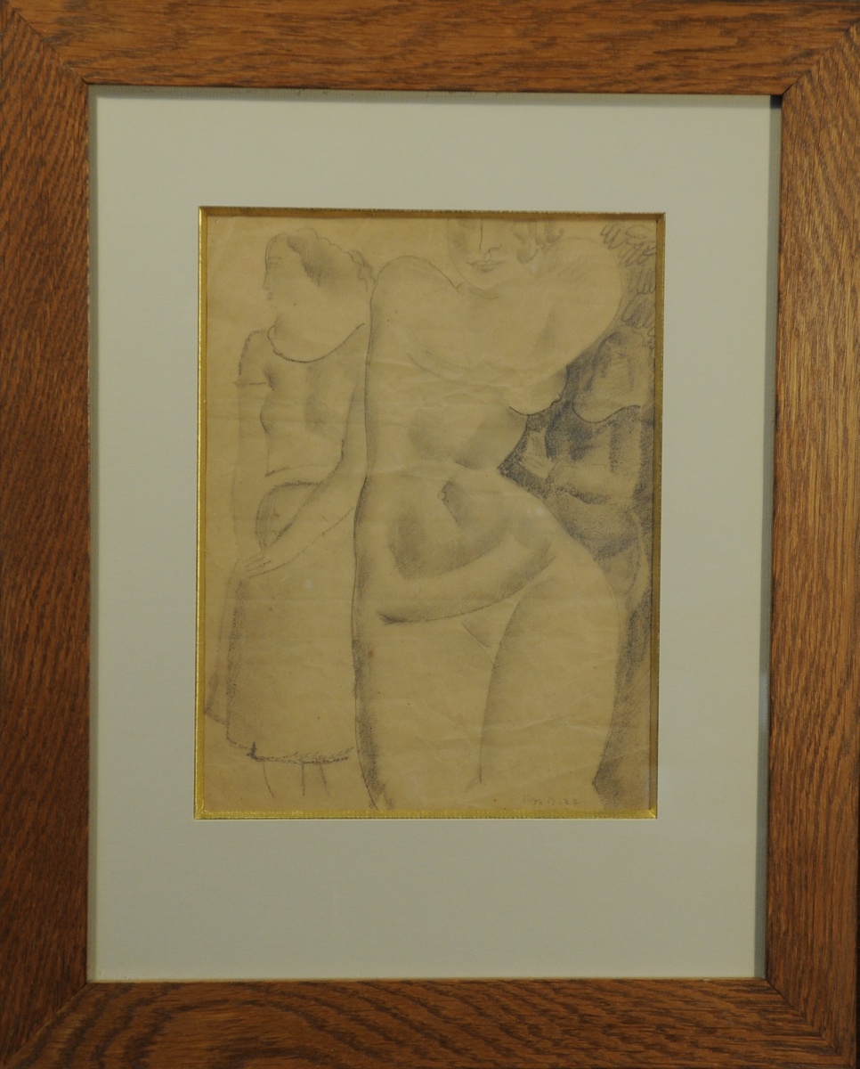 Nu de face, encadré de deux femmes.