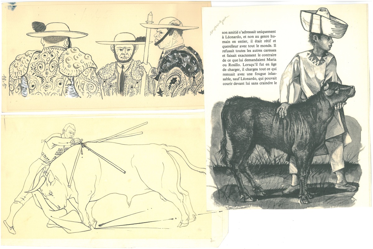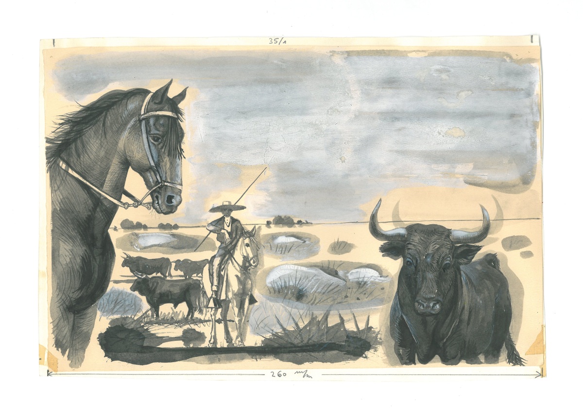 - Garçon et taureau, encre et gouache, 27 x 39 cm. Double page de garde de la fin.