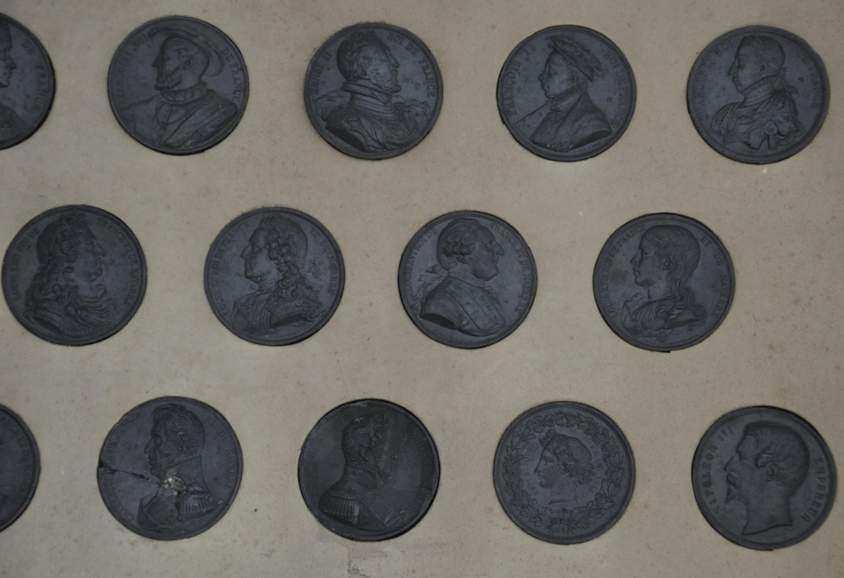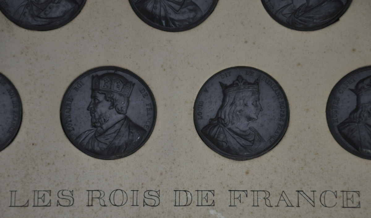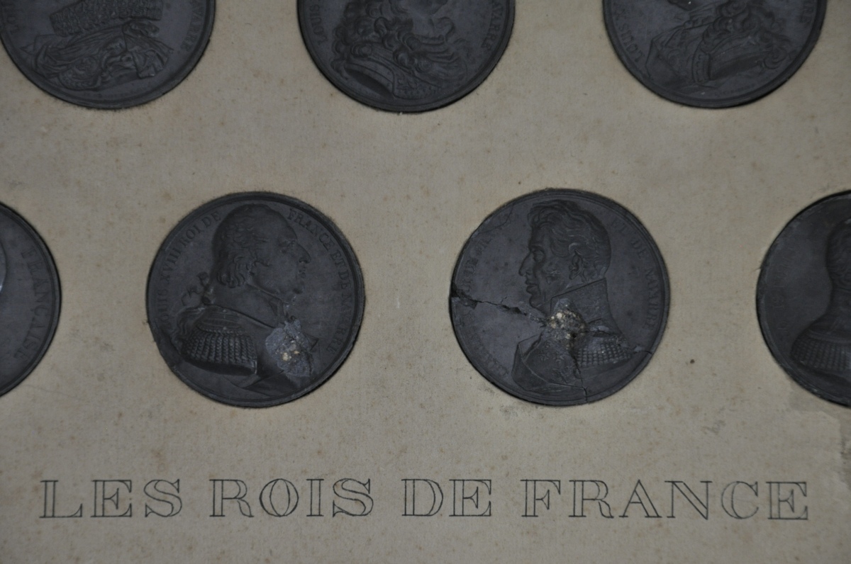 Médaille: Diam . 5 cm. (deux emplacements vides: Philippe II et Napoléon II (?) ; deux médailles abîmées: Louis XVIII et Charles X).