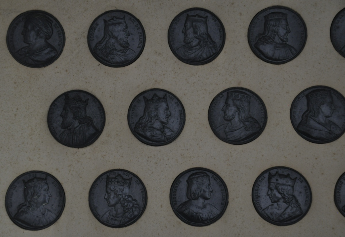 "Galerie numismatique des rois de France". 74 médailles de souffre (?) dans deux cadres.