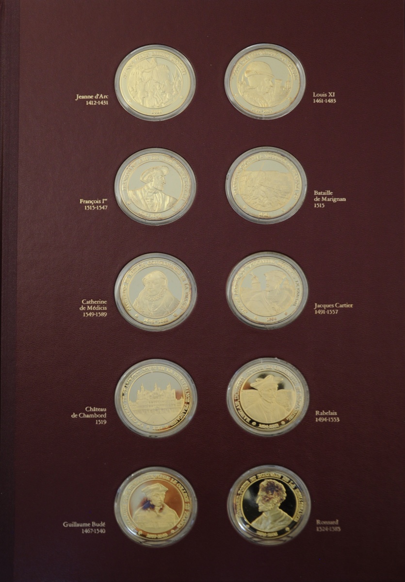 ANCIEN-REGIME. "L'HISTOIRE de FRANCE en MÉDAILLES", Le Médailler, tirage de 1954, Paris. Tome I et II. DEUX ALBUMS comprenant 98 MÉDAILLES en vermeil, Diam. 4,3 cm. Tome I: de Clovis à Jean-Jacques Rousseau, 48 médailles (deux manquantes: Descartes et La Bataille de Fontenoy). Tome II: de Beaumarchais au Traité de Rome, 50 médailles. Poinçon crabe et poinçon d'orfèvre. Certificat d'authenticité signé par Patrick Petit, Président Le Médailler. Poids: environ 3690 g.