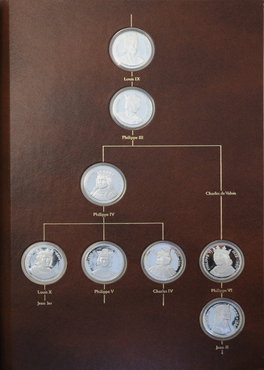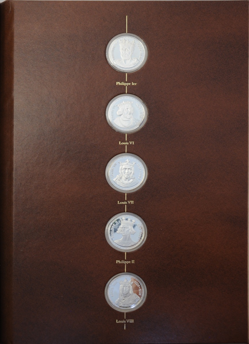 ALBUMS comprenant 46 MÉDAILLES en argent, Diam. 3,8 cm. De Clovis à Louis-Philippe Ier (deux manquantes: François II et Louis-Philippe Ier). Avec 20 notices biographiques. Poinçon crabe et poinçon d'orfèvre. Poids: environ 950 g.