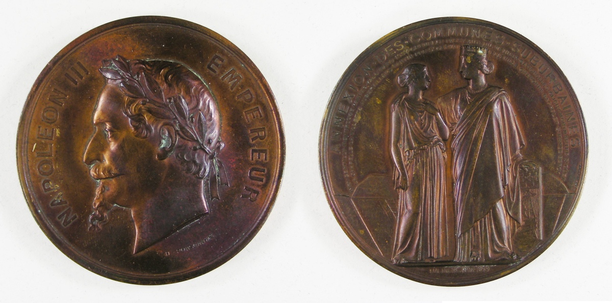 EMPIRE. Second Empire - Napoléon III, MÉDAILLE commémorative du la Loi d'annexion des communes suburbaines, au profil de l'empereur par Ponscarme, bronze, frappe postérieure de la Monnaie de Paris (poinçon corne d'abondance).