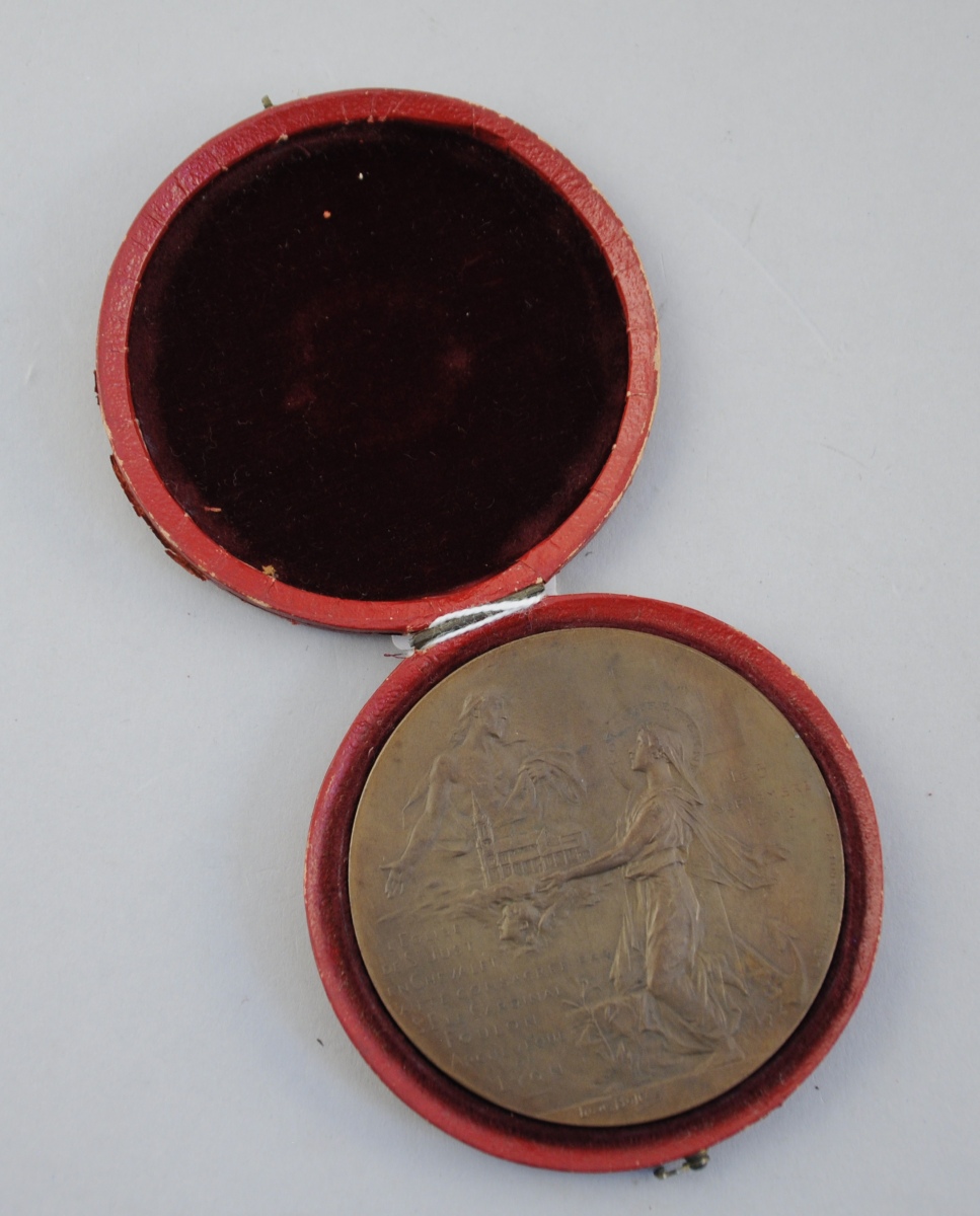 RELIGION. MÉDAILLE commémorative en bronze du " Baron Camille de Rochetaillée" offrant l'église de Saint Just en Chevalet au Coeur Sacré de Jésus le 5 septembre 1892. Face au portrait et avers à l'allégorie de la Foi Chrétienne offrant l'église au Christ. Les deux faces signées Louis Bottée. Écrin de marocain rouge (usures).