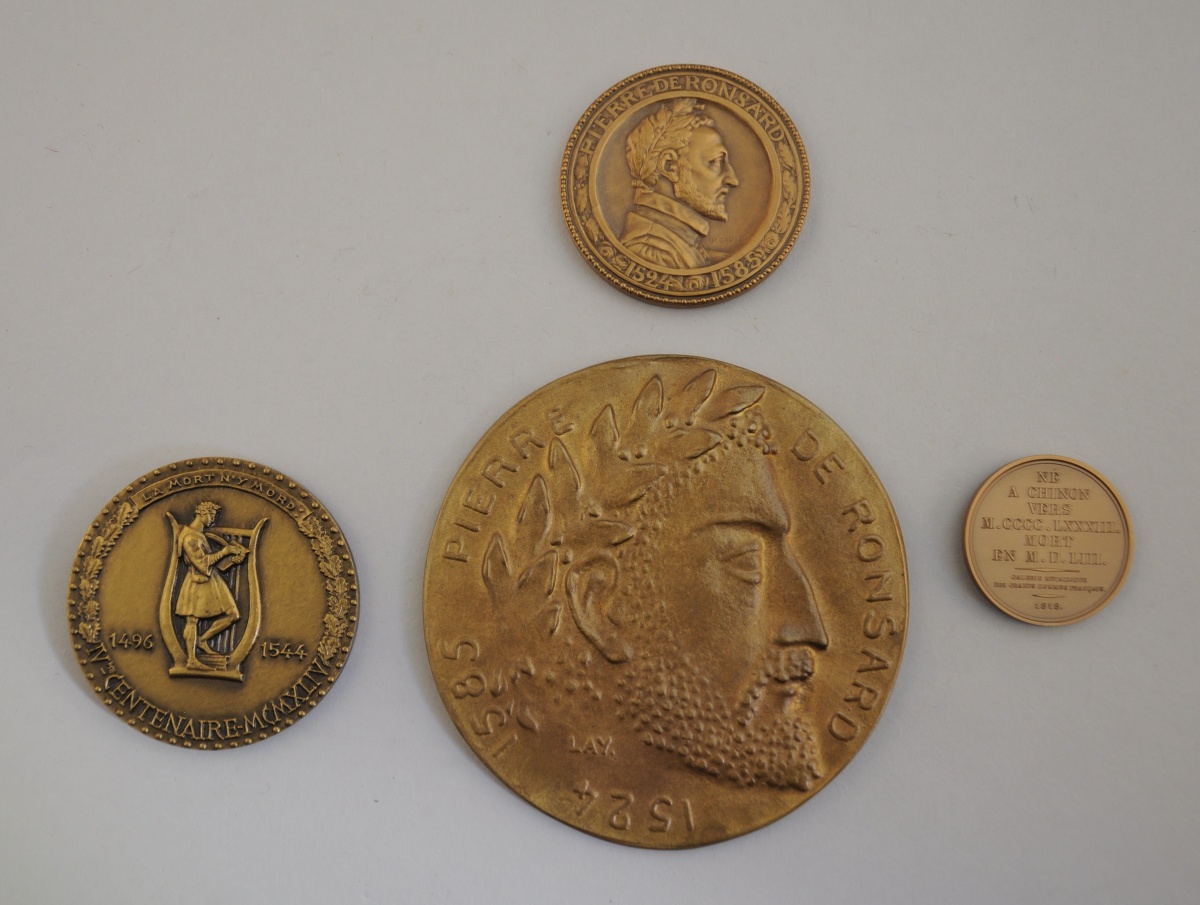 [LITTÉRATURE FRANÇAISE XVI-XVIIe]. 4 médailles commémoratives: "Clément Marot", par Muller; "Pierre Ronsard", par Lay; "Pierre Ronsard", par Dautel; et "François Ravelais", par Gatteaux.
