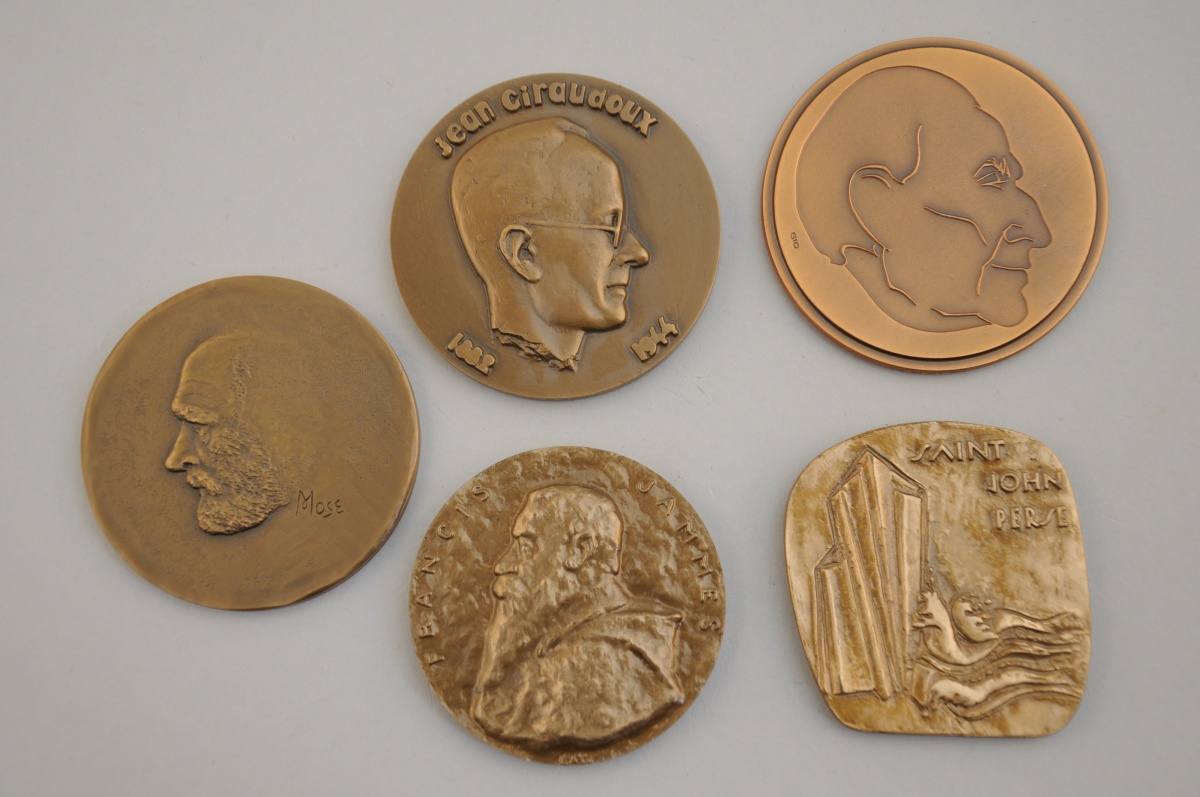 [LITTÉRATURE FRANÇAISE XXe]. 5 médailles commémoratives: "Marcel Brion", par GID; "La cravatte (Apollinaire)", par Mose; "Saint John Perse", marquée au monogramme; "Francis Jammes", par Lay; et Jean Giraudoux, par Revol.