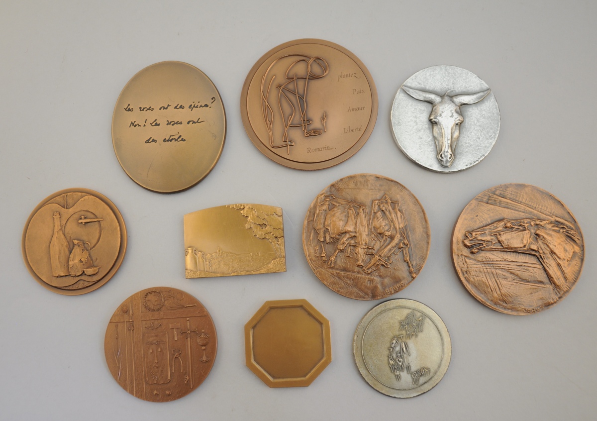 [NATURE]. 10 médailles commémoratives: Vache et paysage, par Delandre; Vaches, par Debus; "Petite noblesse, mais utile et sans faiblesse", par Baron; "Cheval", par Debus; Chèvres, par Auricoste; "Bacchus", par Torlon; "Passiflora Coerulea", par Quillivic; "La rose étoilée" (signature non lisible); "Le cidre", marquée ML; et "Plantez Paix Amoir Liberté Romarin" (signature non lisible).