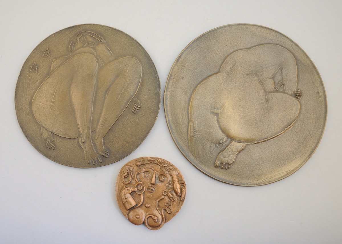 [MÉDAILLES ARTISTIQUES]. Collection de 3 médailles créatives à différents motifs: 2 grandes pièces représentant des femmes nues, par Volti, et Buste de femme aux animaux (signature non lisible).