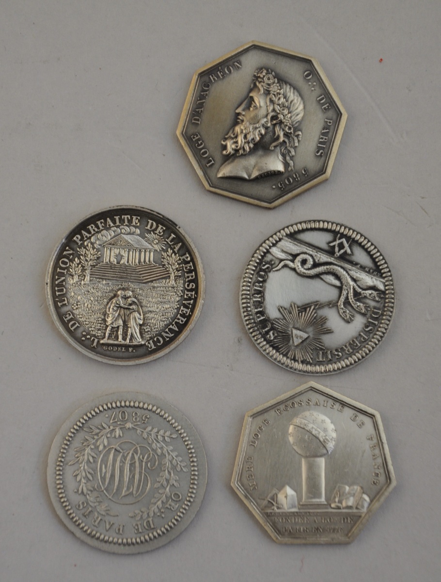 [FRANCMASONERIE]. 5 pièces commémoratives de loges et motifs maçonniques. Argent et bronze argenté.
