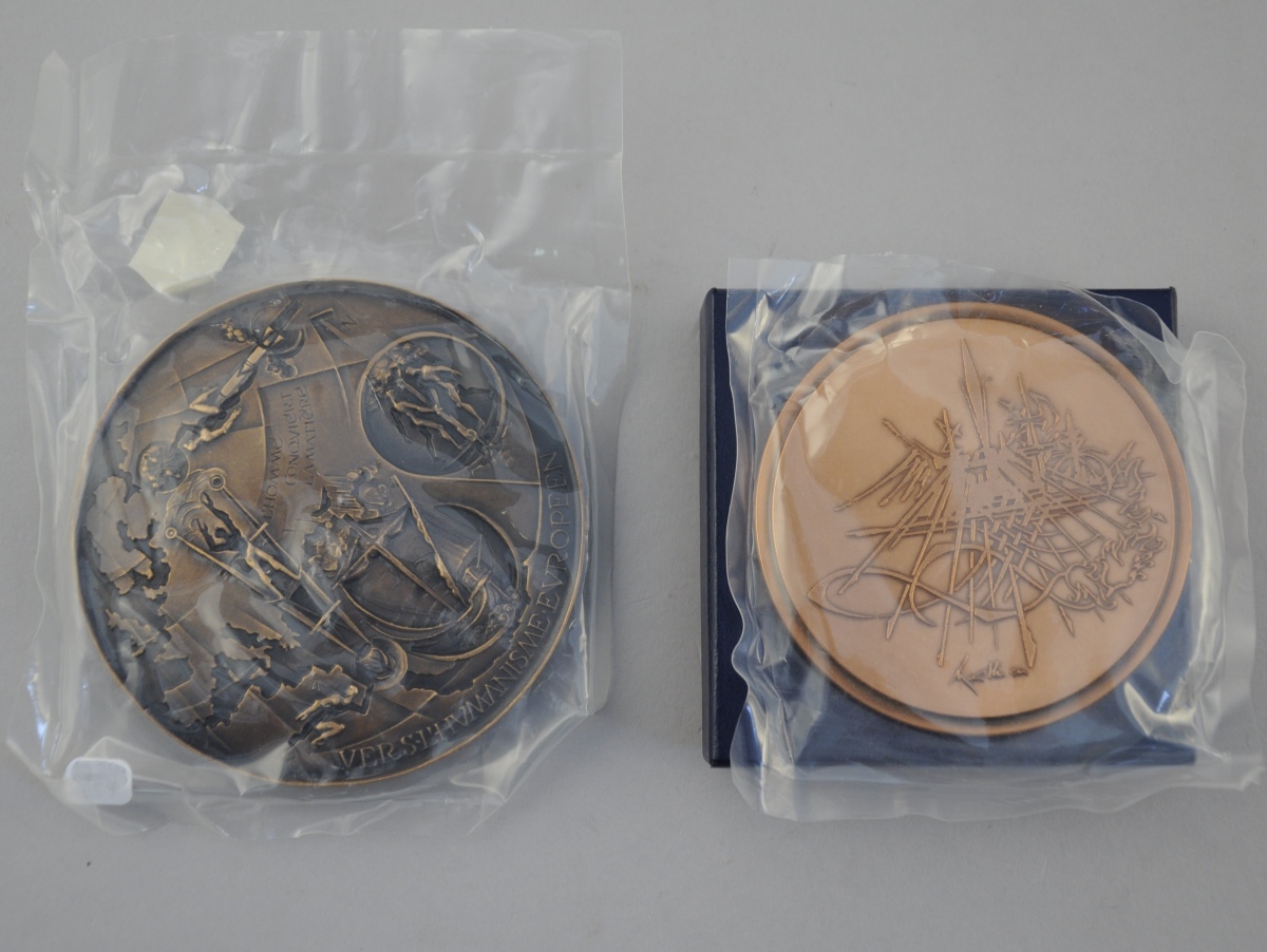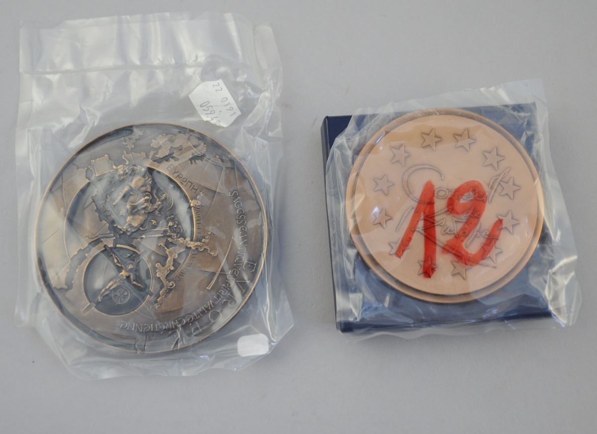 [EUROPE]. 2 médailles commémoratives ayant pour sujet l'Europe: "Europe, Sagesse Antique, Spiritualité Chrétienne"; Diam. 10 cm et "Conseil de l'Europe", de Mathieu; Diam. 8 cm.