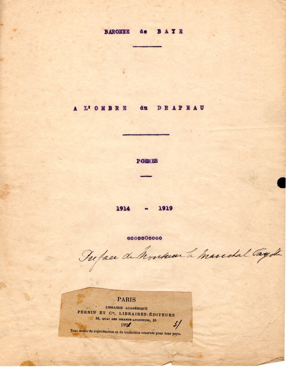POESIE - GUERRE 1914-1918. Réunion de pages manuscrites ou tapuscrites écrites par la baronne de Baye, divers poèmes inspirés de son vécu en tant qu'infirmière bénévole sur le front, dont le recueil " A l'ombre du Drapeau " publié en 1922.