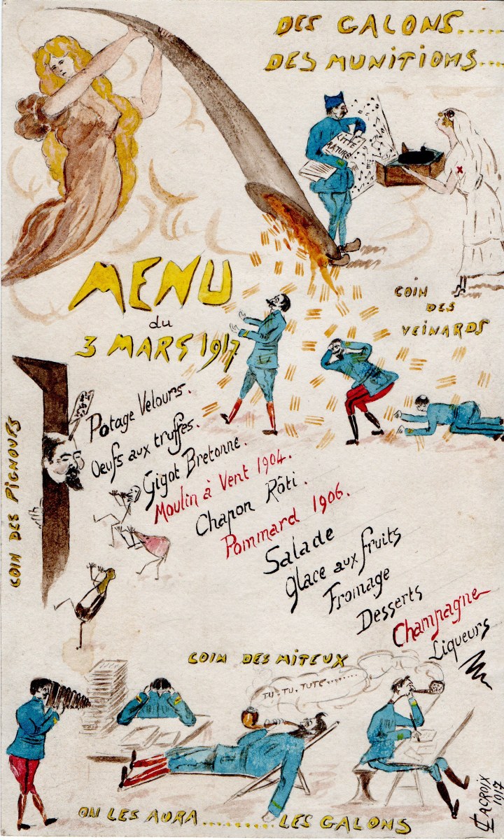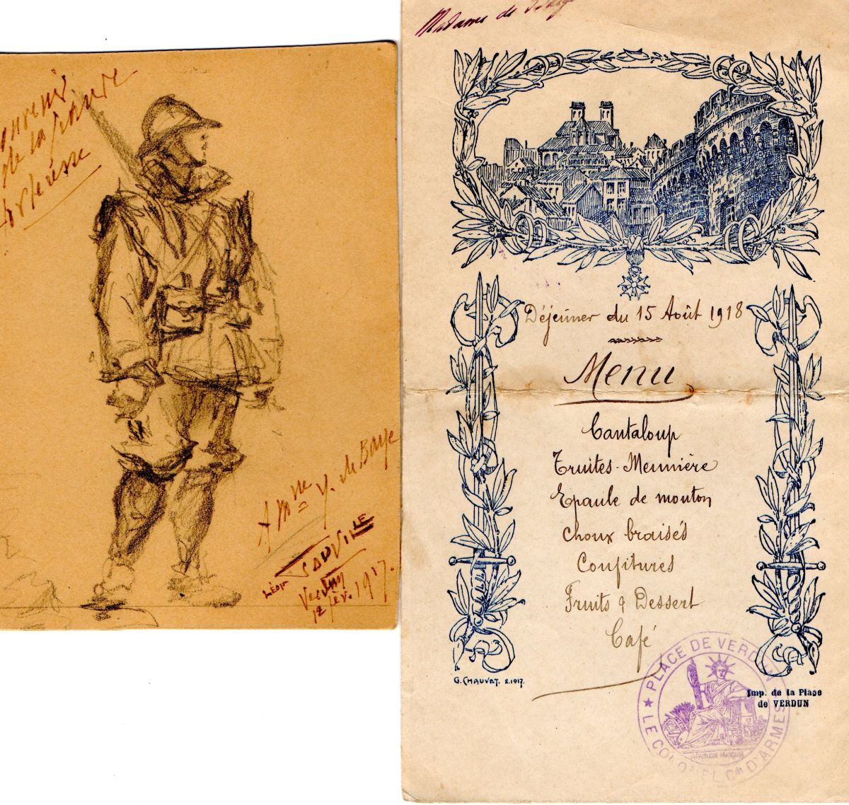 Divers: Verdun, menu du déjeuner du 15 août 1918 avec signatures de plusieurs officiers militaires ; menu manuscrit du 3 mars 1917 à décor de dessins de poilus ; 4 pages manuscrites narrant la célébration des fêtes organisées par Melle de Baye aux poilus ; copie tapuscrite de la lettre de remerciement de Theodore Roosevelt, président des Etats-Unis ; plusieurs documents relatifs à l'administration militaire et des ambulances (permissions, permis de circuler ; nombreuses lettres de soutien et de félicitations au lendemain de la blessure et de la réception de la décoration reçue des mains du général Pétain ; plusieurs correspondances de poilus ; L.A.S. d'une épouse d'officier réclamant l'intervention de Mlle de Baye auprès du général Pétain " son fiancé " ; dessin de poilu ; L.A.S. de Marie-Louise sur aînée de Yolande et L.A.S. de Yolande à son père datée du 27 juillet 1918: " Le moral est si bon chez nous en France. Soldats et chefs font des merveilles (
