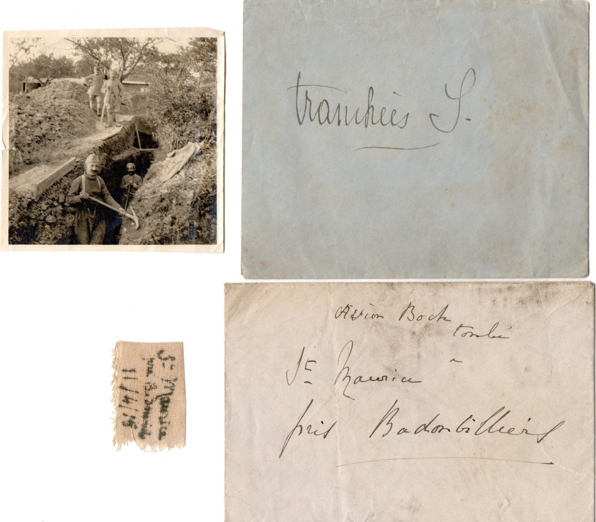 Joint 2 enveloppes contenant une photo de tranchées et un petit morceau de toile d'avion allemand ; lot de 30 clichés photographiques négatifs et 22 tirages positifs représentant Yolande de Baye, infirmière au milieu des blessés, faisant visiter ses ambulances à des officiers généraux, salle d'opération, baraquements, etc ; 24 photos, cartes photos ou cartes postales dont prisonniers allemands ; portraits de Pétain, Joffre, Foch.