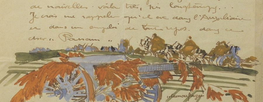 Mobilisé en 1914, Mathurin Méheut entretient depuis les tranchées avec sa marraine de guerre, Jeanne Dutilh, dessins et correspondance qui deviennent une échappatoire aux horreurs de la Grande Guerre. À partir de janvier 1915, de jeunes femmes soutiennent moralement et psychologiquement les combattants, par des envois de colis, de cadeaux, de photographies qui entretiennent l'espoir en attendant la Victoire. Cette correspondance est un précieux témoignage de la vie dans les tranchées. L'artiste y retranscrit, dans une vérité presque documentaire, la vie quotidienne des poilus avec l'énergie et la spontanéité qui lui sont propre.