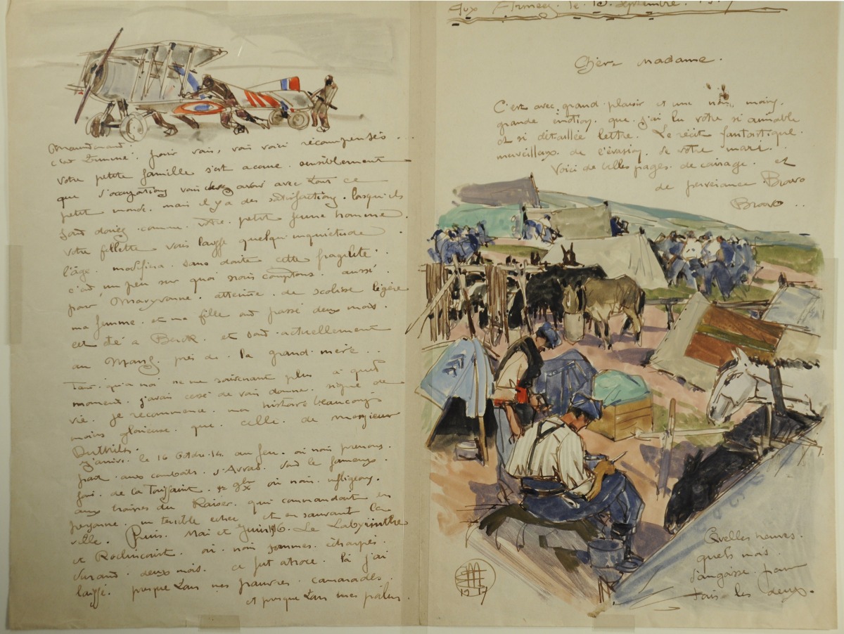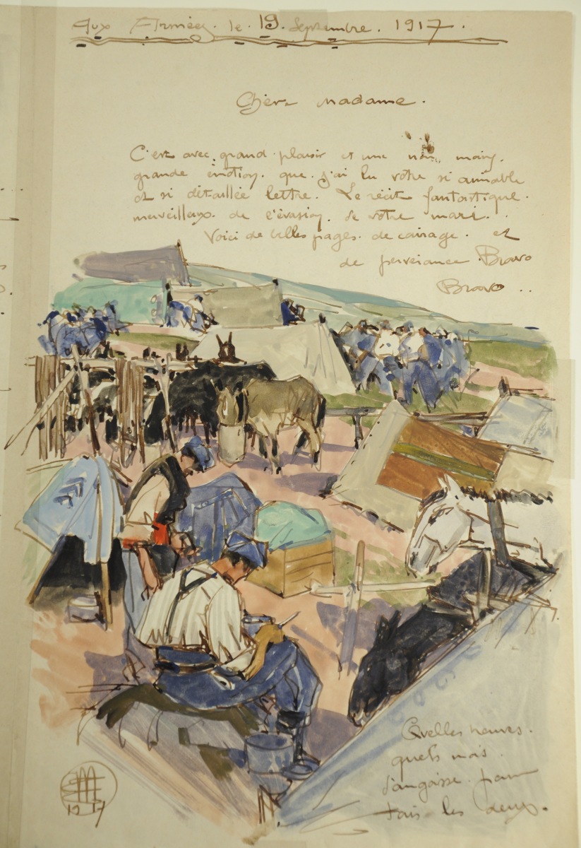Mathurin Méheut envoie des nouvelles du Front: "J'arrive le 16 octobre 1914 au feu où nous prenons part aux combats d'Arras. Durant le fameux jour de la Toussaint où nous infligeons aux troupes du Kaiser qui commandait un terrible échec."