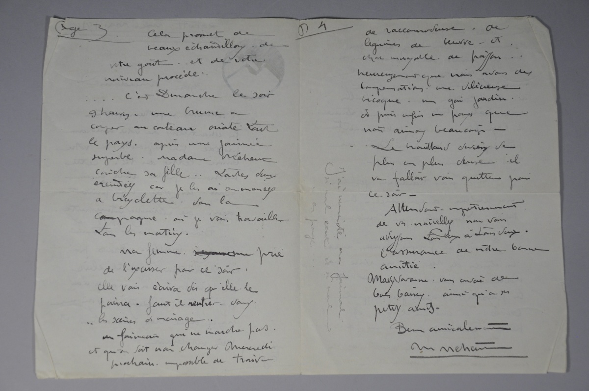 Mathurin Méheut envoie quelques nouvelles de sa famille: "Ici nous travaillons ferme. Ma femme a commencé un tapis. Moi j'ai presque terminé avec les études de Mer et me voici à nouveau à courir et la mer et les paysans