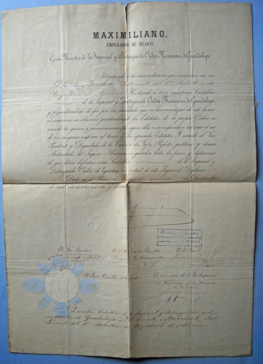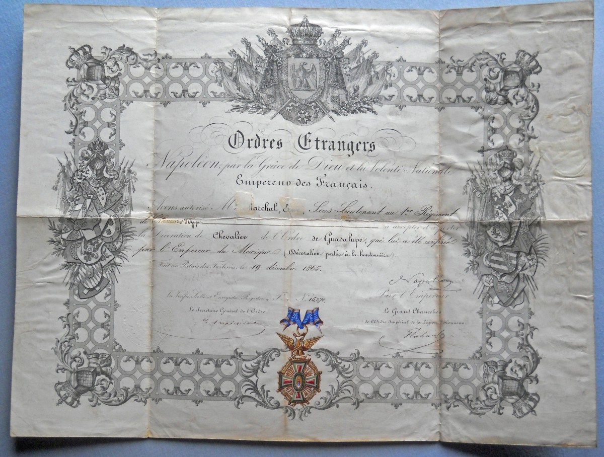 Réunion de + de 65 pièces (L.S., L.A.S., P.S. et divers) concernant la carrière militaire d'Ernest MARCHAL: 8 pièces relatives à sa carrière d'officier et à la campagne du Mexique dont diplôme de chevalier de l'ordre impérial mexicain de Notre Dame de Guadalupe signé par Maximilien Ier empereur du Mexique daté du 15 décembre 1864 avec cachet à sel ; lettre de la grande chancellerie donnant l'autorisation de porter la médaille de l'ordre mexicain, datée du 19 décembre 1865 et décorée d'une belle représentation en couleurs peinte de la médaille ; diplôme de la médaille commémorative de l'expédition du Mexique, 1864 - 46 pièces relatives à la campagne de 1870-1871 dont notes, ordres et correspondance adressées au lieutenant-colonel Marchal par le quartier général de la 3e division du 24e corps d'armée (dont L.S. du général Carré de Busserolles) - 5 pièces relatives à la promotion de chevalier de la légion d'honneur dont diplôme du 14 janvier 1872 - 9 pièces relatives au dépôt d'un brevet d'invention d'obus à charge de fulmicoton déposé par Marchal et Jardoux en 1887 - Portrait photographique d'Ernest Marchal par un studio londonien, 15 x 11,5 cm hors cadre - Portraits au crayon et rehauts d'Ernest Marchal et d'un enfant, avec envoi manuscrit daté du 17 juillet 1887 et signature d'Allan Österlind.