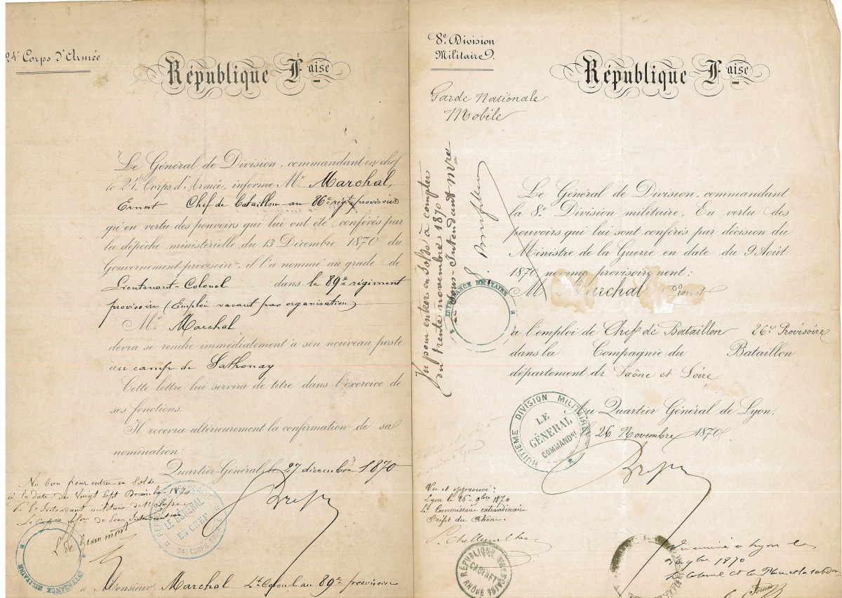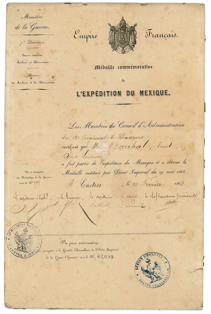 Ernest MARCHAL (1837-1902), né à Wassy (Haute-Marne) eut une carrière militaire des plus exemplaires. Intégrant le corps militaire dès l'âge de 12 ans comme enfant de troupes, il s'engagea comme soldat volontaire à 17 ans dans le 12e régiment de dragons basé à Saint Germain-en-Laye. Il gravit en à peine 5 ans tous les échelons de sous-officiers (brigadier en 1854, maréchal des logis chef en 1859) et réussit à être incorporé en 1858 dans le régiment des guides de la garde impériale, véritable troupe d'élite et de prestige sous le Second Empire. Ce début de carrière déjà fort prometteur va connaître une nouvelle ascension en 1863. Il intègre le corps d'officier en tant que sous-lieutenant dans le 12e régiment de chasseurs à cheval. En décembre 1863, il rejoint le corps expéditionnaire du Mexique et participe aux opérations militaires de cette campagne jusqu'au début de l'année 1865, passant du 1er régiment de chasseurs d'Afrique au régiment des guides. De retour en France, Ernest Marchal démissionne de l'armée d'active et se retire dans ses terres bourguignonnes. Mais le déclenchement de la guerre franco-prussienne en 1870 le rappelle à reprendre les armes. Il est mobilisé en octobre 1870 comme chef de bataillon du 86e régiment d'infanterie provisoire de la garde nationale mobile de Saône-et-Loire. De par son expérience, il est promu le 25 décembre 1870 à 33 ans seulement lieutenant colonel dans le 89e régiment d'infanterie provisoire. Décoré de la médaille de chevalier de l'ordre du Mexique en 1864, promu chevalier de la légion d'honneur en 1872.