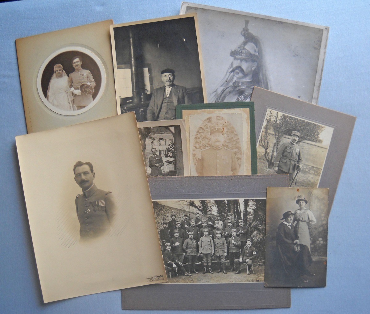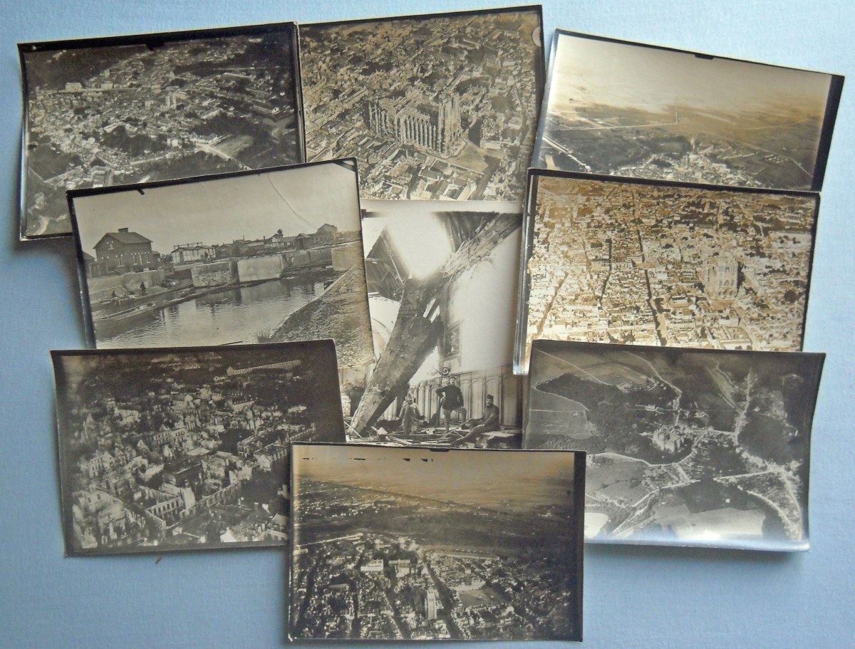 Lot de 14 documents et 25 clichés photographiques relatifs au déroulement de carrière d'Ernest Louis Adrien MARCHAL, dont: États de service durant la période 1914-1919 - Tapuscrit de 5 pages d'historiettes racontées par un témoin oculaire durant la guerre 1914-1918 - Carte des préparations de la guerre au cours de l'année 1917 éditée par L'Ouest-Eclair - Diplômes d'officier et de commandeur à l'ordre de Nichan Iftikhar de Tunisie, 1930 et 1945 - 16 clichés photographiques dont 14 vues aériennes des villes françaises et belges situées en zone de front (Bergues, Ypres, Dunkerque, Dixmude, etc), 1917-1918 - 9 photos de famille dont portrait du lieutenant Marchal - Vues de Rouen, paire d'eau-forte à rehauts de couleurs, signées " Victor Valéry " en bas à droite, , 34 x 25,5 cm - Portrait en pied d'un poilu, dessin encre et aquarelle par Charles Rocher de Gérigné (1890-1962), signé et daté 1931 en bas à droite, 27 x 19 cm - Portrait en buste d'une vieille femme à la coiffe , dessin à l'encre et crayon par Charles Rocher de Gérigné (1890-1962), signé et daté 1930 en bas à gauche, 32 x 24 cm - Cavalier de l'armée britannique, dessin à l'encre et aquarelle par " E. Rousselot " dédicacé et daté 1920 en bas à droite, 32,5 x 25,5 cm (acctds) - Soldat de l'armée française du XVIIe siècle, dessin à l'encre et aquarelle par " P. Martin ", dédicacé et daté Paris 1923 en bas à gauche, 37,5 x 28 cm (accdts).