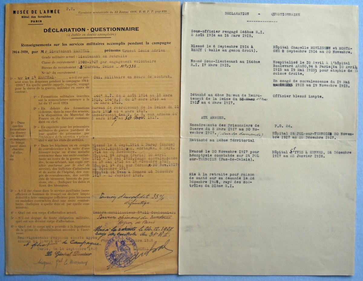 Ernest Louis Adrien MARCHAL (1889-1961), petit fils du précédent, né à Liège en Belgique, entre à l'école militaire de Rambouillet comme enfant de troupes en 1903. A la sortie de l'école, il s'engage comme volontaire en 1907 et incorpore le 82e régiment d'infanterie. Dès le déclenchement de la grande guerre, il est blessé à Barcy (Marne) et sera cité à l'ordre du régiment pour s'être particulièrement distingué au combat ayant réussi avec quelques hommes a arrêté une avance ennemie. En 1915, il est promu sous-lieutenant et est affecté au 164e régiment d'infanterie. En 1918 il est promu lieutenant et est détaché comme conservateur adjoint au musée de l'armée où il y terminera sa carrière militaire. Il fut décoré de la croix de guerre étoile de bronze, de la médaille de la Victoire, de la médaille commémorative de la grande guerre et lui fut décerné le grade de chevalier de la légion d'honneur en 1928.