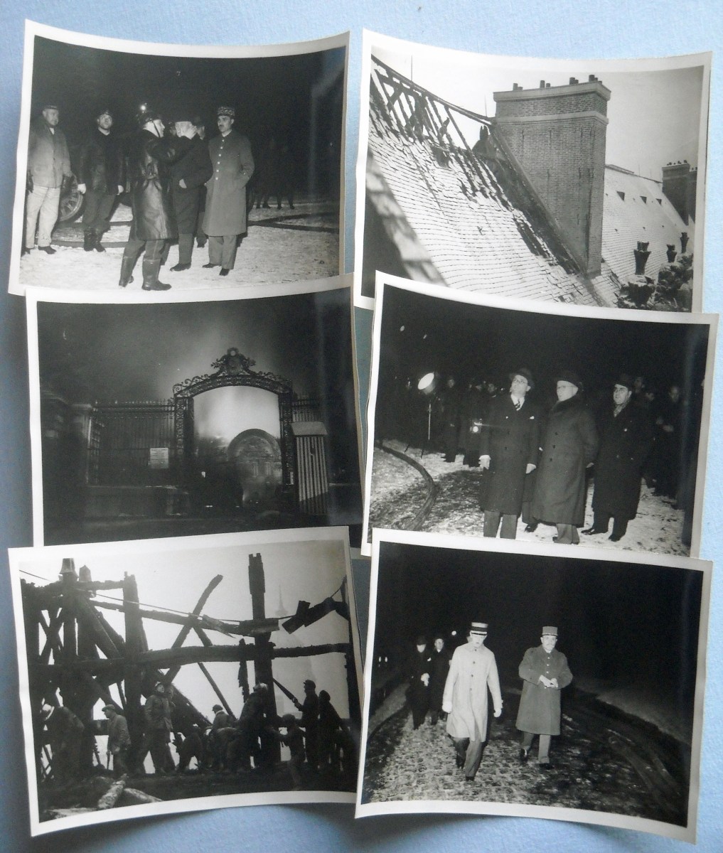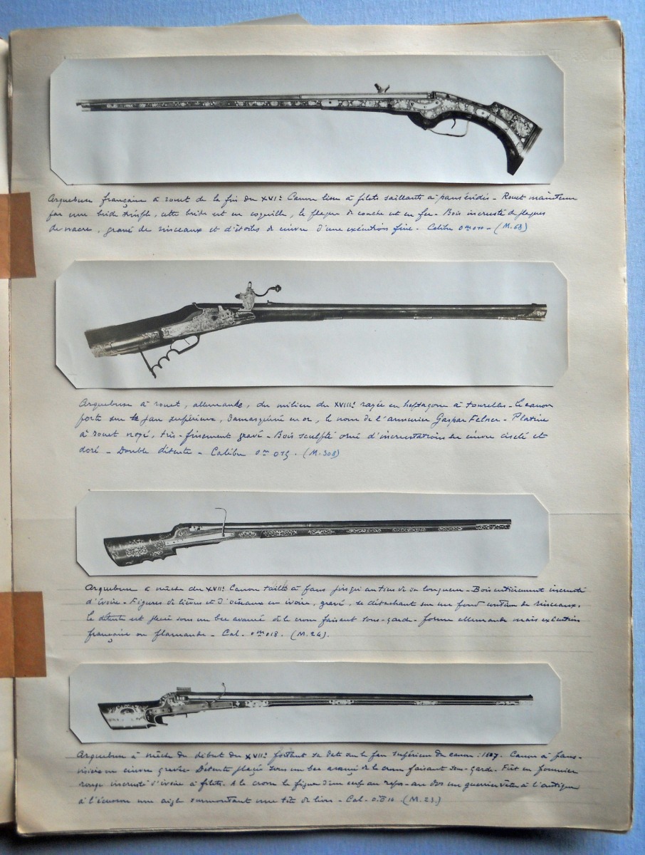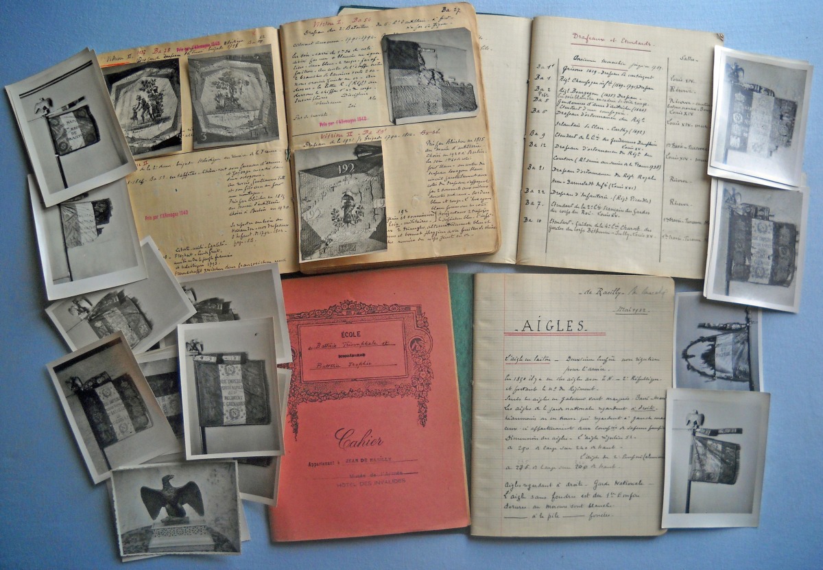 Réunion de + de 340 documents relatifs à des événements et aux collections conservées au musée de l'armée, 1908-1945 dont 4 cahiers in-4 contenant + de 130 pages manuscrites: " Batterie triomphale et batterie trophées ", historique et notices des 40 bouches à feu reposant sur l'esplanade des Invalides, daté de 1908 ; Inventaire et emplacement des drapeaux, étendards et aigles, établi entre 1932 et 1940, avec descriptif détaillé, illustration et signalement des pièces prises par l'occupant allemand en 1940 - 19 pages in-fol. de partie d'inventaire d'armes blanches et d'armes à feu avec descriptifs détaillés et clichés photographiques - + de 180 clichés photographiques de casques, armures, armes blanches, armes à feu, artillerie, salles du musée (Gribeauval, Masséna) - 12 clichés photographiques relatifs à l'incendie sous les combles du musée de l'armée dans les années 1925-1930 - 25 clichés photographiques divers dont cérémonies officielles.