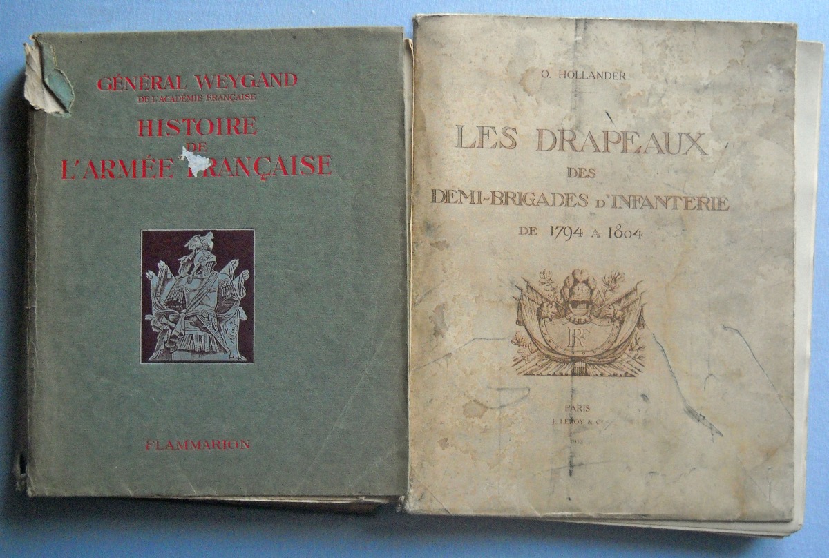 Joint: O. Hollander: Les drapeaux des demi-brigades d'infanterie de 1794 à 1804. Paris, Leroy, 1913, in-4, br. couv. impr. (débr.). Illustré de 25 planches hors-texte et de nombreuses illustrations en noir et en couleurs. Important chapitre préliminaire sur les drapeaux des régiments d'infanterie de 1791 à 1794 - Général Weygand: Histoire de l'armée française, Paris, Flammarion, 1938, in 4 br., couvert. bleue impr. et rempliée (en l'état), riche et abondante iconographie sur l'histoire de l'Armée Française, des Gaulois jusqu'en 1918, en couleurs et en noir et blanc, hors texte et dans le texte comprenant des photos, documents, cartes, gravures, etc. - Jean Brunon: La légende napoléonienne et les polonais, des légions de Dombrowski à l'escadron des chevau-légers polonais à l'île d'Elbe (1796-1815), collection Raoul et Jean Brunon, 23 pp., couv. salie.