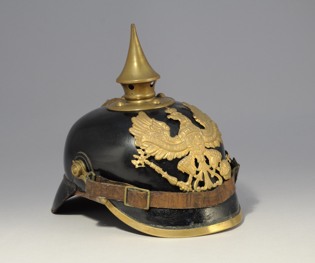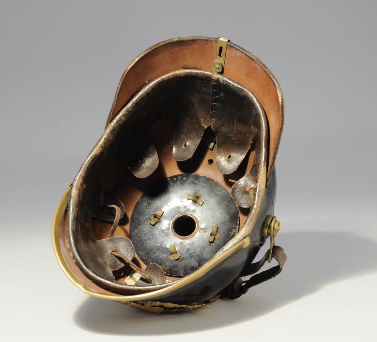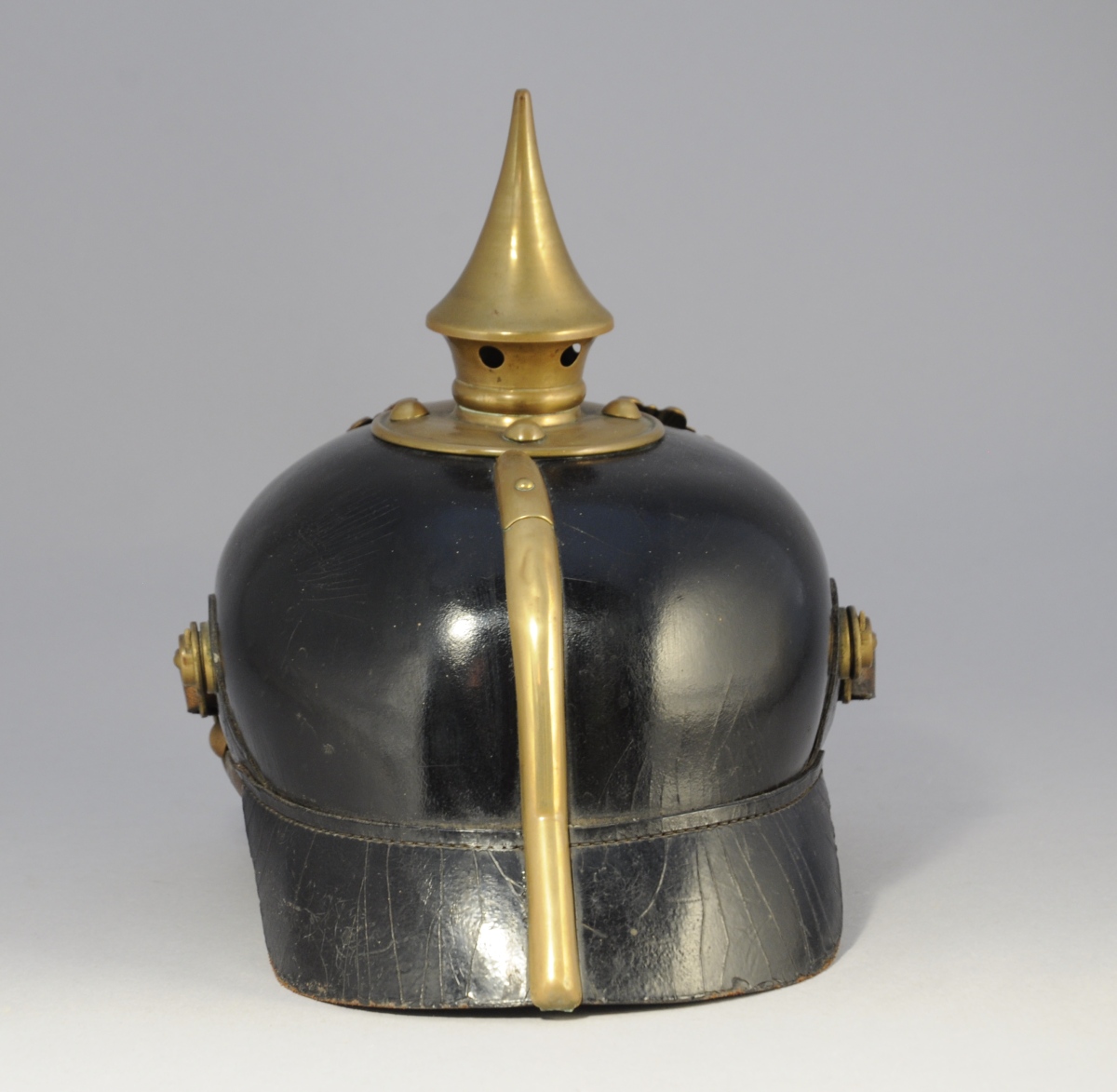 PRUSSE. CASQUE À POINTE. Bombe en cuir et garnitures de laiton. Coiffe intérieure et jugulaire en cuir. (cocardes manquantes)