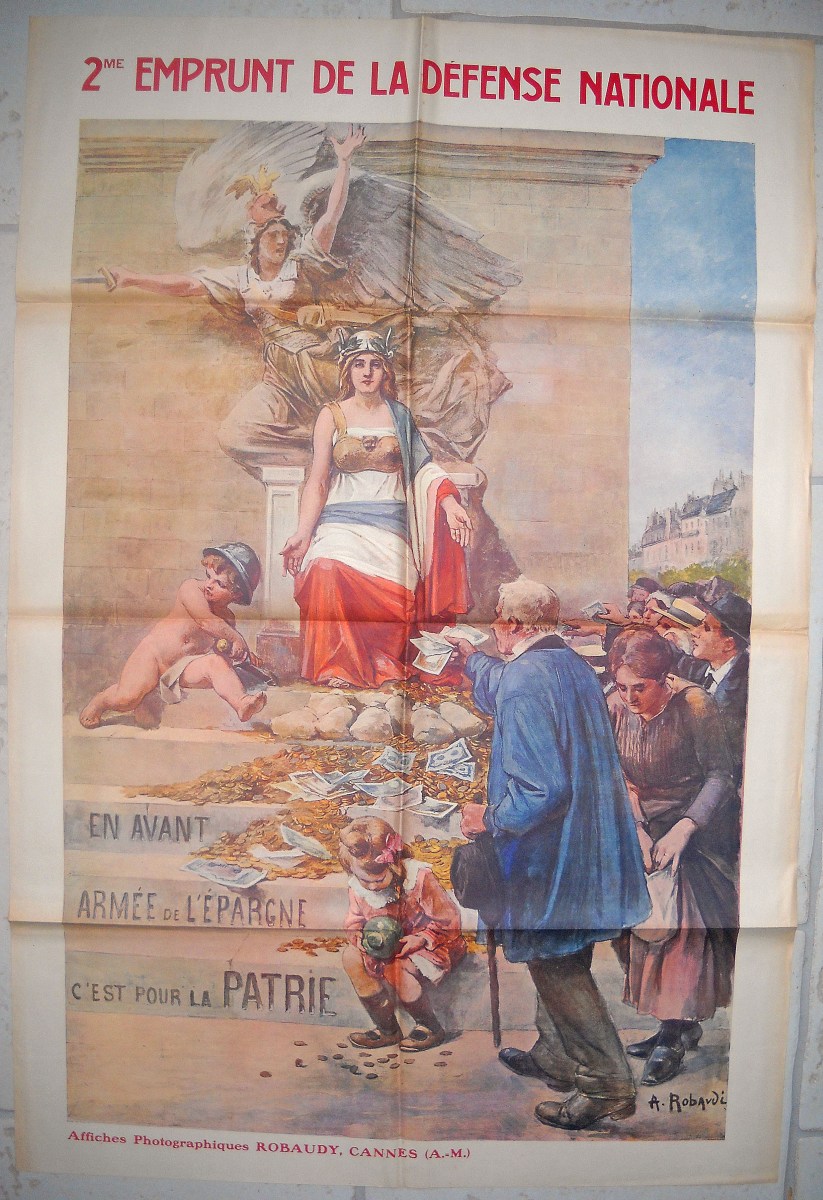 5 affiches: " Pour la victoire. Deuxième emprunt de la Défense Nationale, souscrivez " par A. Léchaudel, Impr. Nationale, 88 x 65 cm, traces de plis, petits défauts, B.E. - 7 affiches: " Français, souscrivez au deuxième emprunt de la défense nationale. Vous hâterez la victoire et vous aurez fait votre devoir envers la patrie. ", par Bernard Naudin, Impr. Crété, 119 x 79 cm, traces de plis, T.B.E. - 8 affiches: " On les aura! 2e Emprunt de la Défense Nationale. Souscrivez " par Abel Faivre, Devambez impr. Paris, 113 x 79 cm, traces de plis, petits défauts, B.E. à T.B.E. - 7 affiches: " 2e emprunt de la défense nationale. En avant armée de l'épargne, c'est pour la patrie. " par Alcide Robaudi, Affiches photographiques Robaudy, Cannes, 118 x 81 cm, traces de plis, petits défauts, B.E. à T.B.E. - 6 affiches: " Deuxième emprunt de la défense nationale. Agriculteurs français versez à l'emprunt et vous hâterez la victoire. ", Imp. Lapina Paris, 114 x 80 cm, traces de plis, B.E. à T.B.E. - " Banque de France. Emprunt de la défense nationale