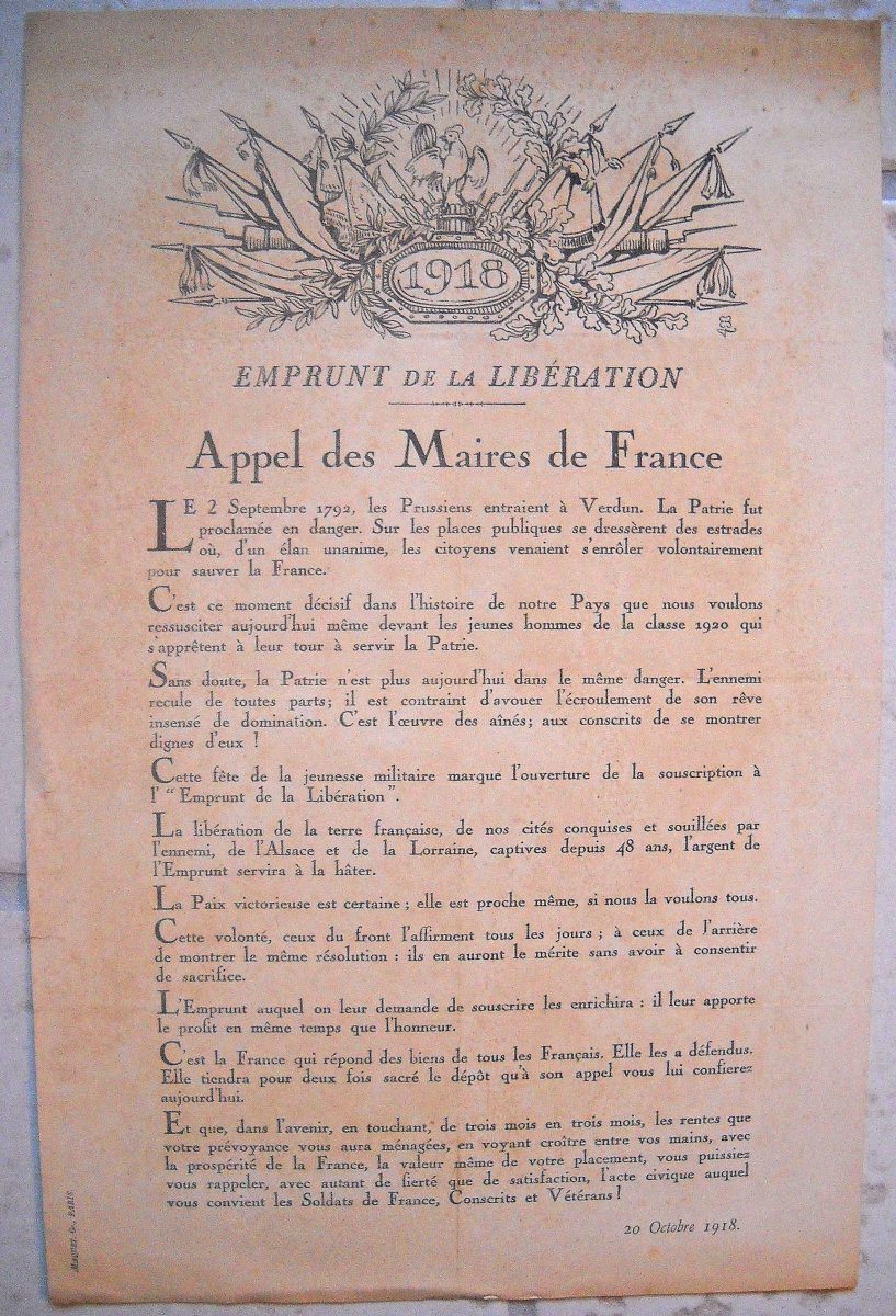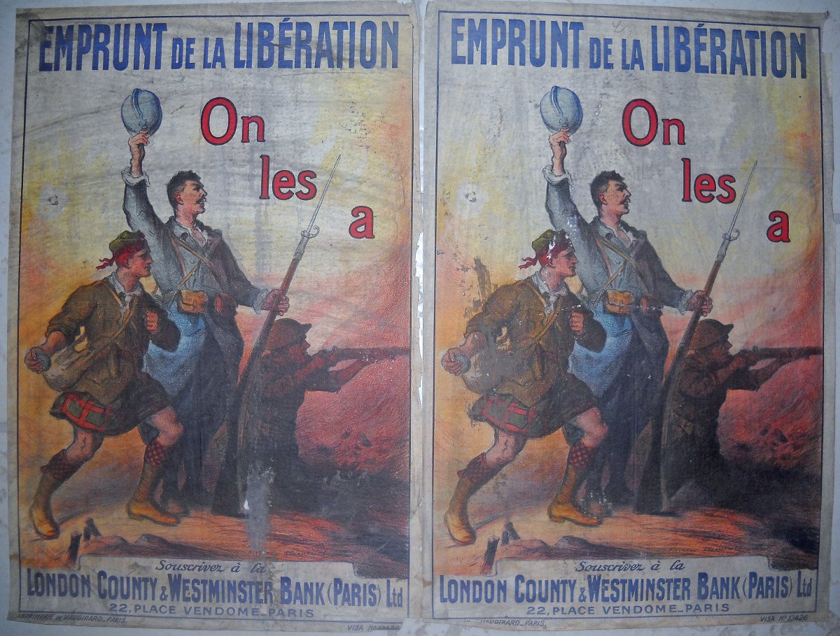 2 affiches: " Emprunt de la libération. On les a. Souscrivez à la London County and Westminster Bank (Paris) " par Firmin Bouisset, Impr. de Vaugirard Paris, 59 x 39 cm, état moyen - 2 affiches à texte: " Emprunt de la victoire. Appel aux populations d'Auvergne ", 76 x 56 cm, T.B.E. - " Emprunt de la libération. Appel des maires de France ", Maquet Gr. Paris, 44 x 28,5 cm, B.E.