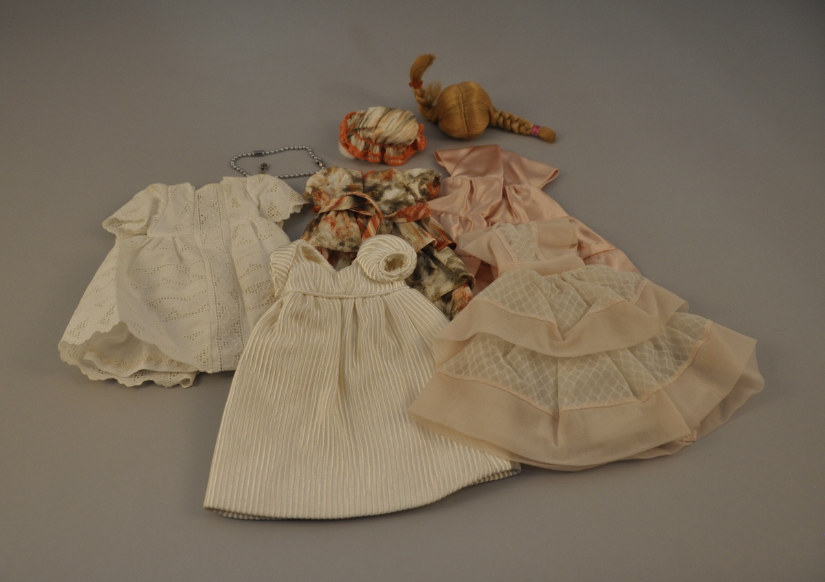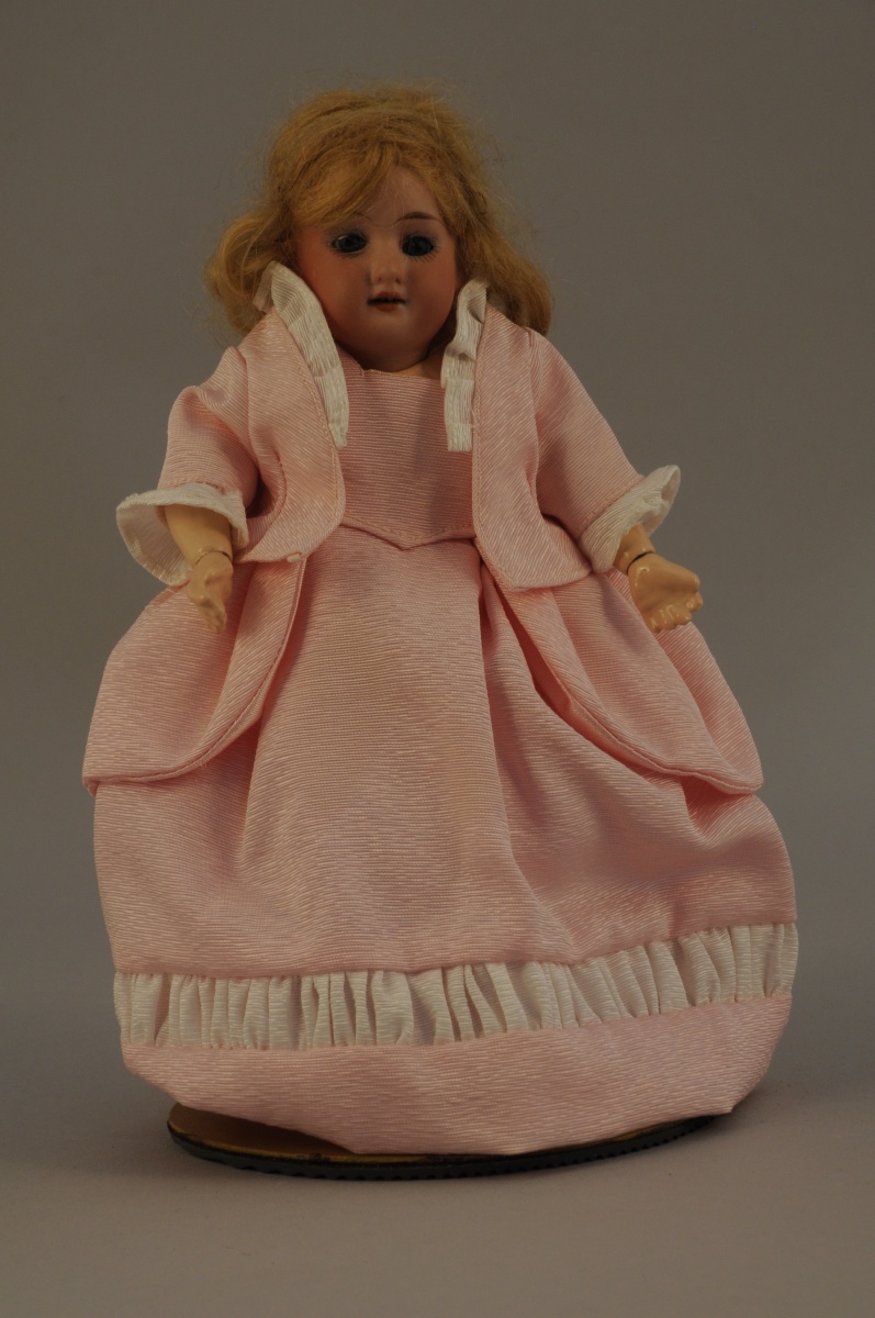 MIGNONETTE poupée articulée. Tête en porcelaine marquée "germaine (?) 1246 / 310", yeux bleux ouvrant, bouche ouverte. Cheveyx blonds. Corps articulé en carton. Avec son trousseau de cinq robes modernes et un support. XIX-XXe. Haut. 22 cm.