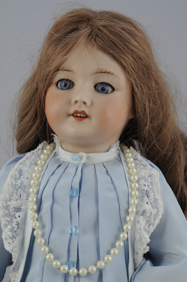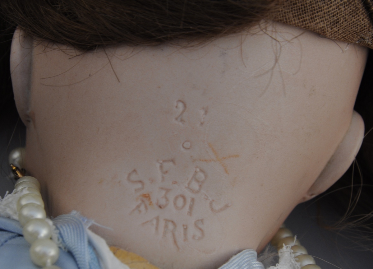 POUPÉE, tête porcelaine "SFBJ 301 PARIS", bouche ouverte, yeux sulfure bleus, corps articulé, habits, perruque. Haut. 48 cm. Collection orléanaise.
