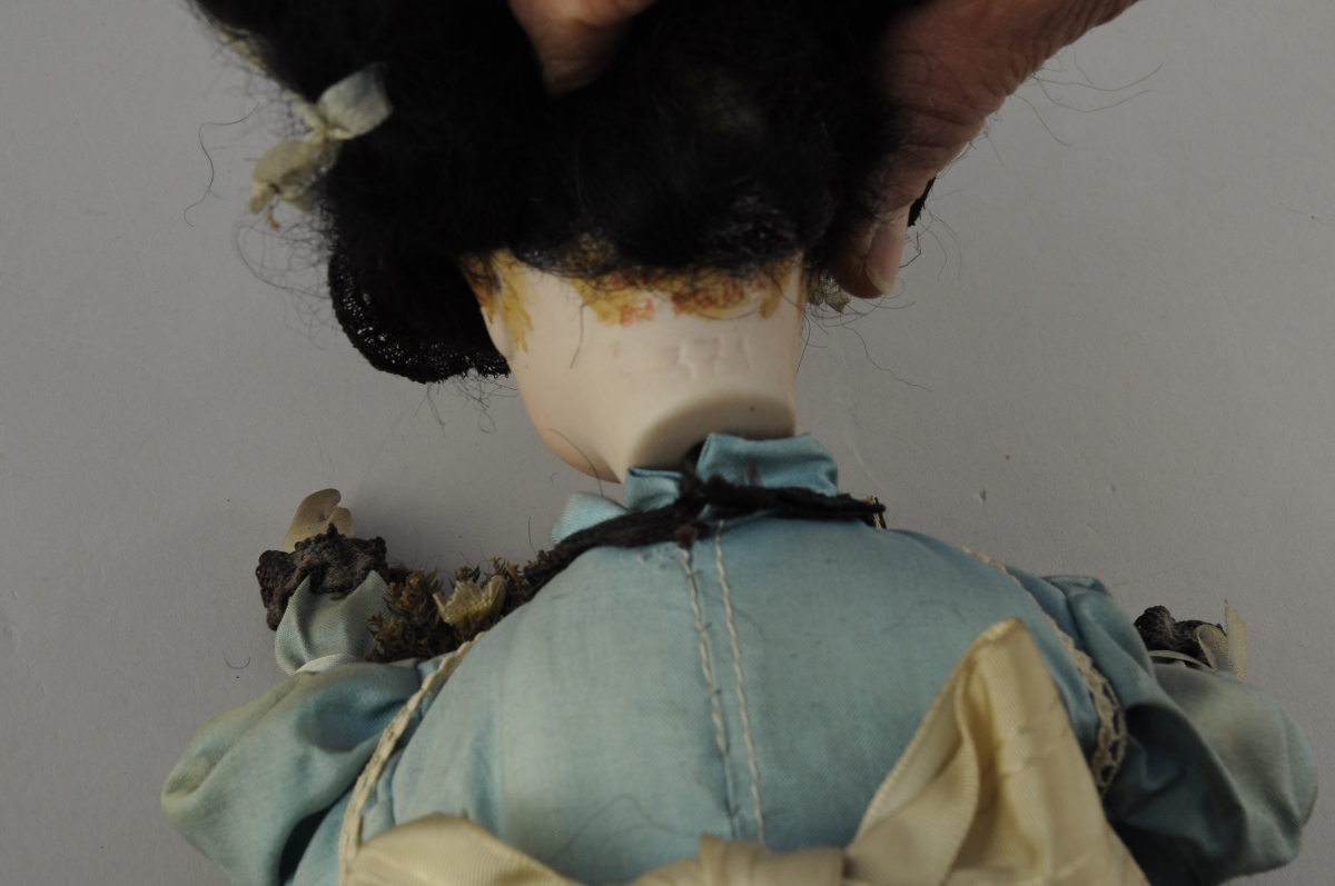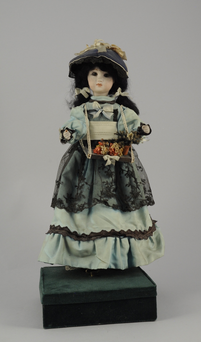 POUPÉE- AUTOMATE "la petite marchande de fleurs", tête porcelaine, bouche fermée marque tampon rouge "Bté SGDG" et en creux "371". Habits, perruque. Tête pivotante de droite à gauche, et bras articulés de haut en bas, musicalité - état de fonctionnement.