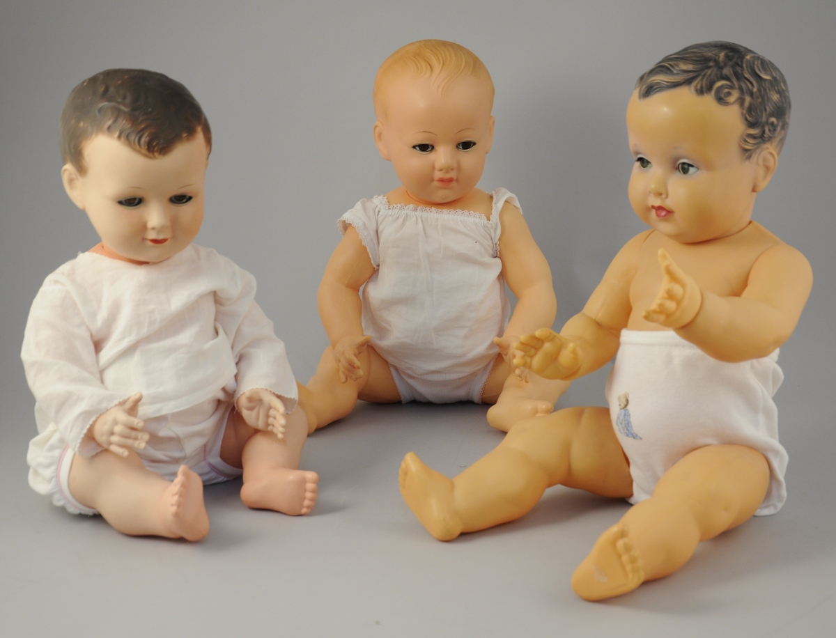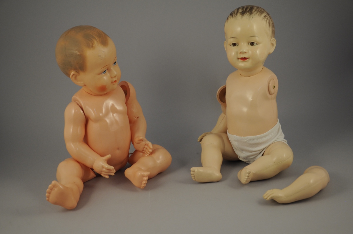 - POUPON en celluloïd, yeux mobiles, cheveux bruns moulés, tête et membres articulés. Numéroté 60. Milieu du XXème. Haut. 60 cm.