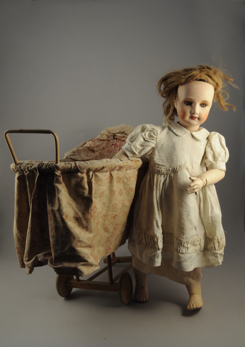 Grande POUPÉE UNIS FRANCE, la tête en porcelaine (taille 11, marquée 71 / 109 / 301), yeux fermant, bouche ouverte, cheveux roux. Le corps articulé, vêtu d'une robe en soierie blanche. Haut. totale: 67 cm (état d'usage).