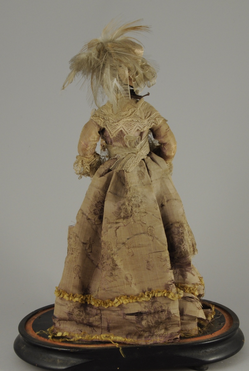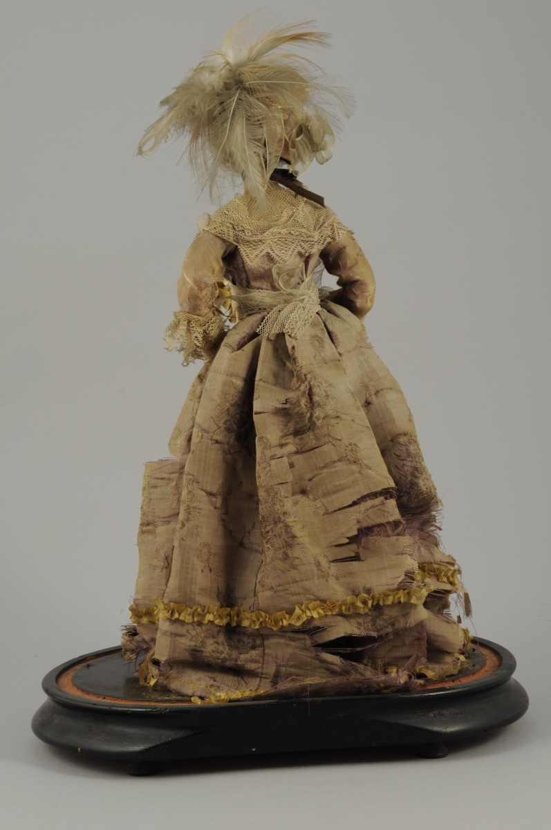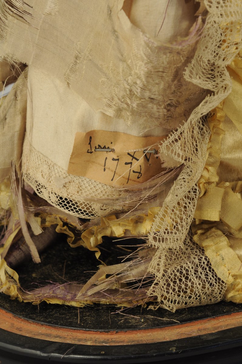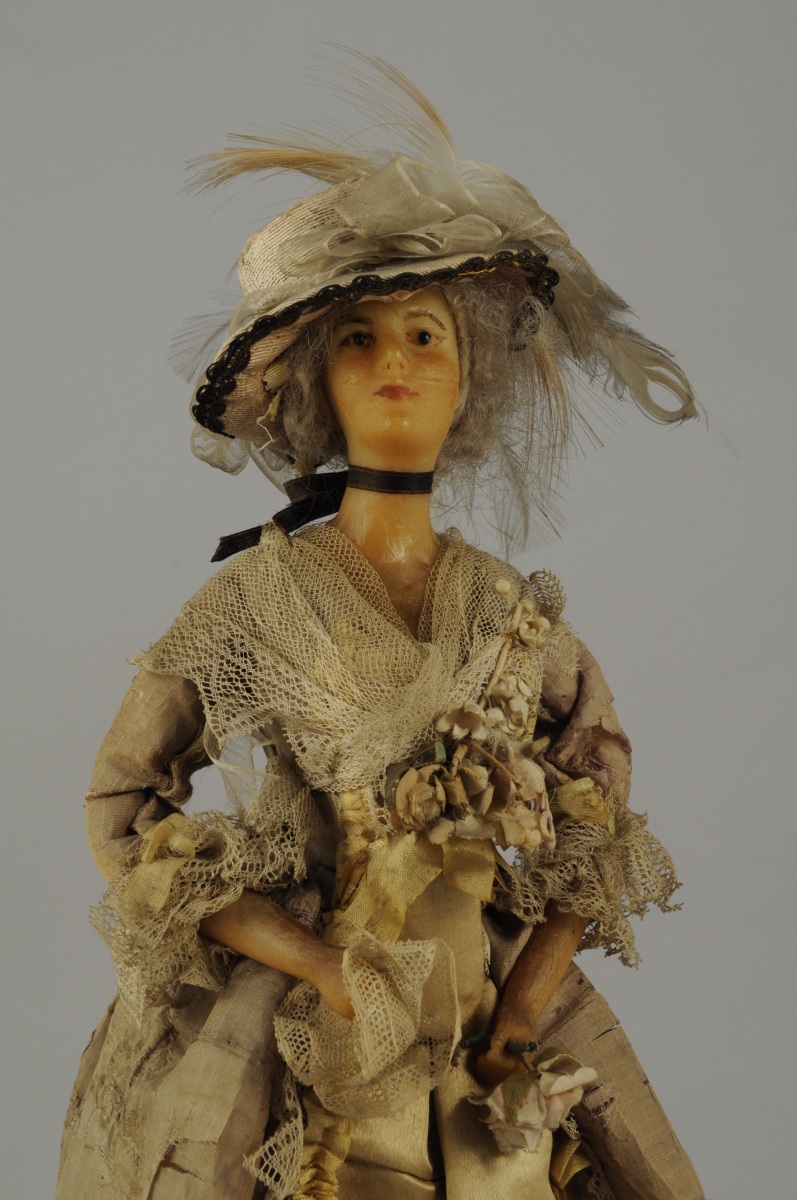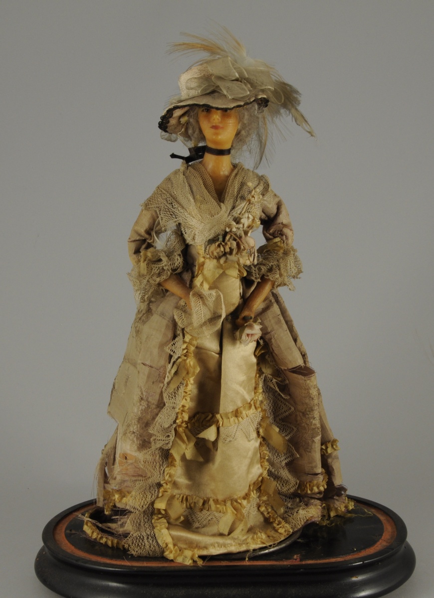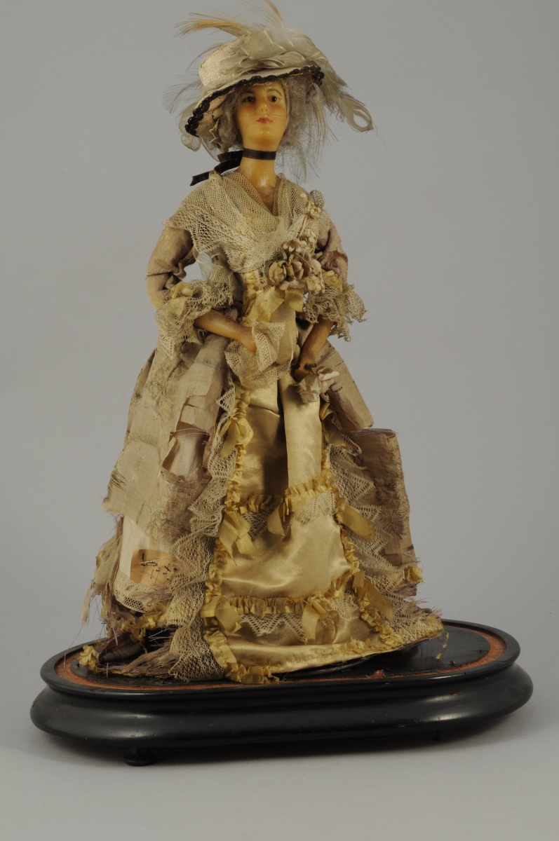 POUPÉE de mode avec buste et bras en cire. Cheveux gris naturel. Corps articulé en tissu bourré. Elle est vêtue d'une robe en dentelle et en soie jaune et beige agrémentée de fleurs et d'un chapeau à plumes dans le goût du XVIIIe siècle.