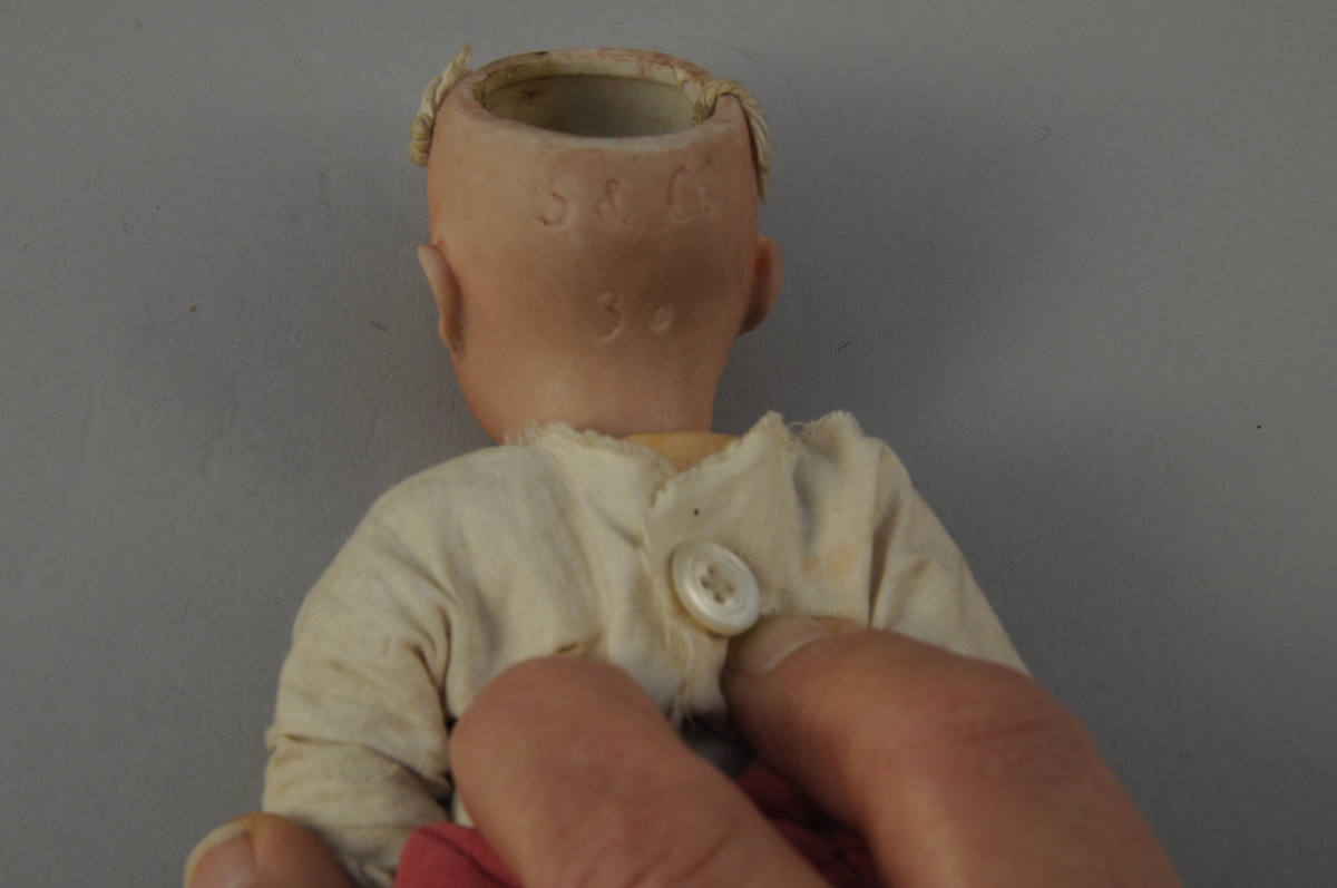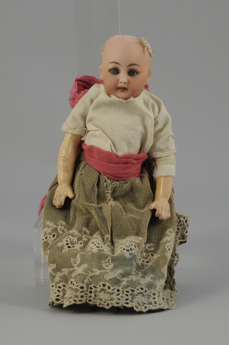 S & C. POUPÉE. Tête en porcelaine, bouche ouverte, yeux bleus fixes, corps articulé en composition. Vêtue d'une chemise blanche en coton et d'une jupe longue en dentelle appliquée. Marqué derrière la tête "S & C / 3/0". Début XXème. Haut. 21,5 cm. (manque les cheveux, usures)