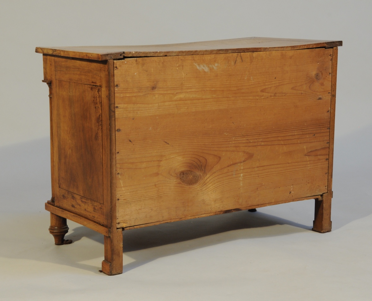 COMMODE DE MAÎTRISE en noyer ouvrant en façade par quatre tiroirs, dont un en ceinture. Montants antérieurs à colonnnes détachées se terminant par des pieds toupies. Garniture de bronzes tels qu'entrées de serrures en écusson ornées de branchages feuillagés et boutons de tirages.