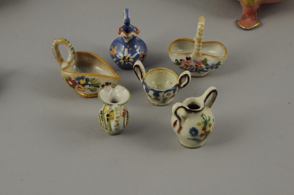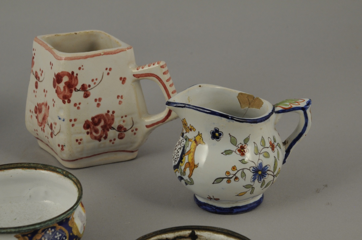 Éléments de DINETTE, 25 PIÈCES en faïence, porcelaine et métal émaillé dont: saucière, moutardier, saupoudreuse, salières, bols japonisants, verseuse, burettes...
