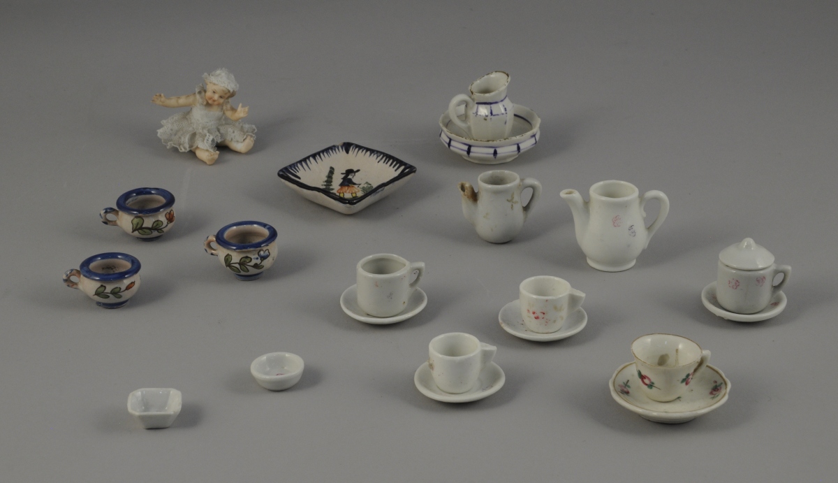 -Divers en porcelaine: 3 TASSES et leurs SOUS-TASSES, un RAVIER, une CAFETIÈRE et un SUJET figurant un enfant vêtu de dentelle.